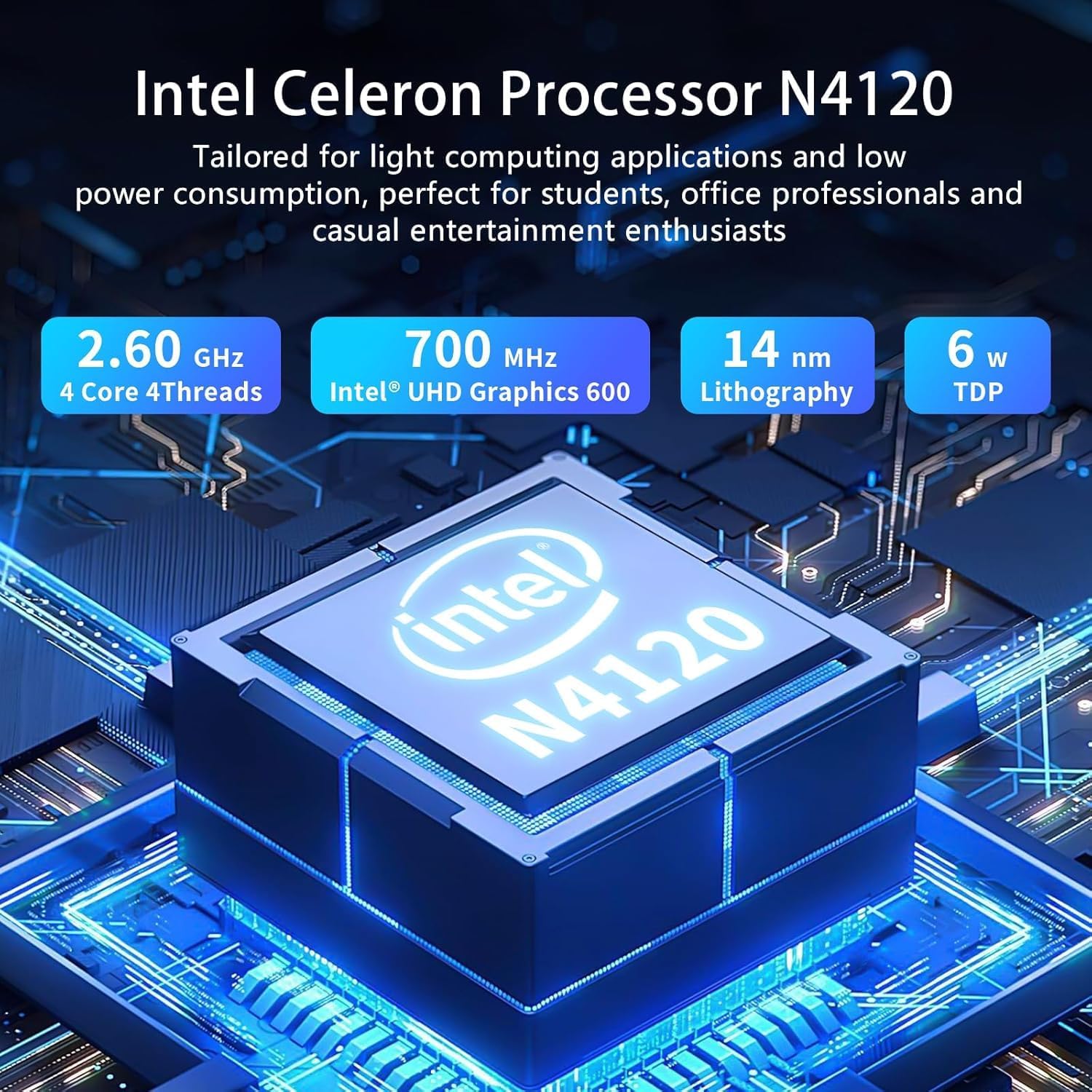 Quad Core Intel Celeron N4120Intel Celeron N4120 (1.1 GHz base frequency up to 2.6 GHz burst frequency 4 MB L2 cache 4 cores 4 threads). This quad-core Intel Celeron laptop has the perfect combination of performance power consumption and value that helps your device handle multitasking smoothly and reliably with four processing cores to divide up the work.