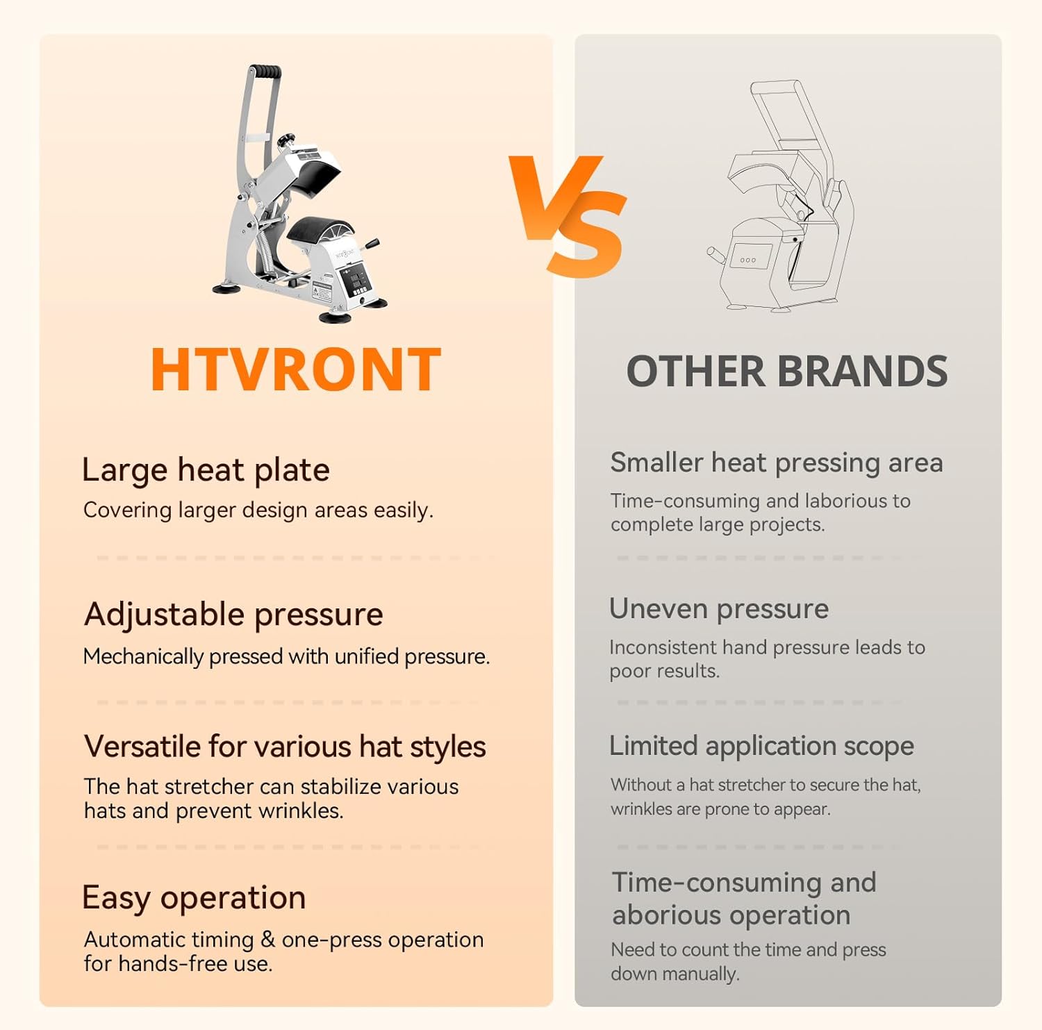Fits 99% of Cap Shapes: This hat press is equipped with two platens 6.5 inch x 3.3 inch (16.6cm x 8.5cm) & 6.5 inch x 2.5 inch (16.6cm x 6.5cm) and we improved the curvature of the cap platens and the front and back widths so that this hat heat press machine fit 99% of the cap shapes without any wrinkles.