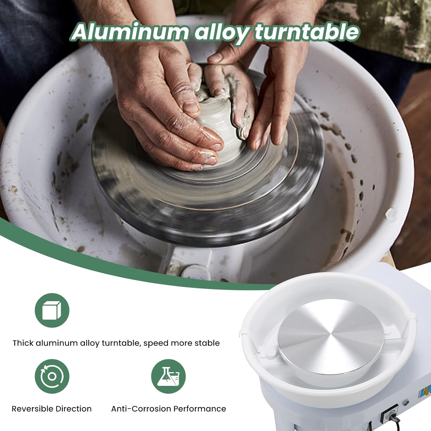 Well-made potter's wheel: Aluminum alloy turntable & bright finish body scratch-resistant and wear-resistant. Plug with leakage protection to ensure safe use. Thickened foot pads for non-slip and stable placement