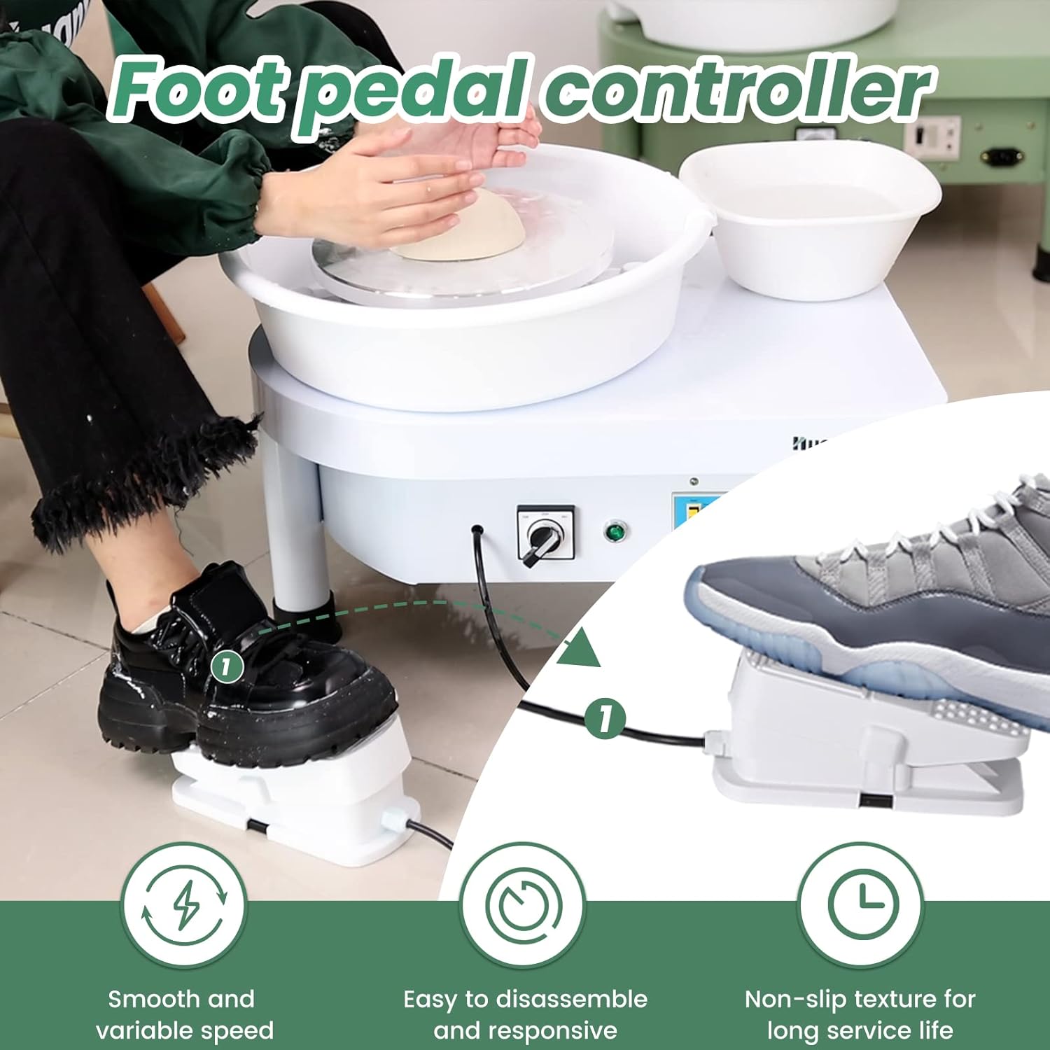 Adjustable speed control system: pottery wheel adopts the stepless speed regulation motor simplifying the complexity and controlling the speed through foot pedal making pottery processing more convenient