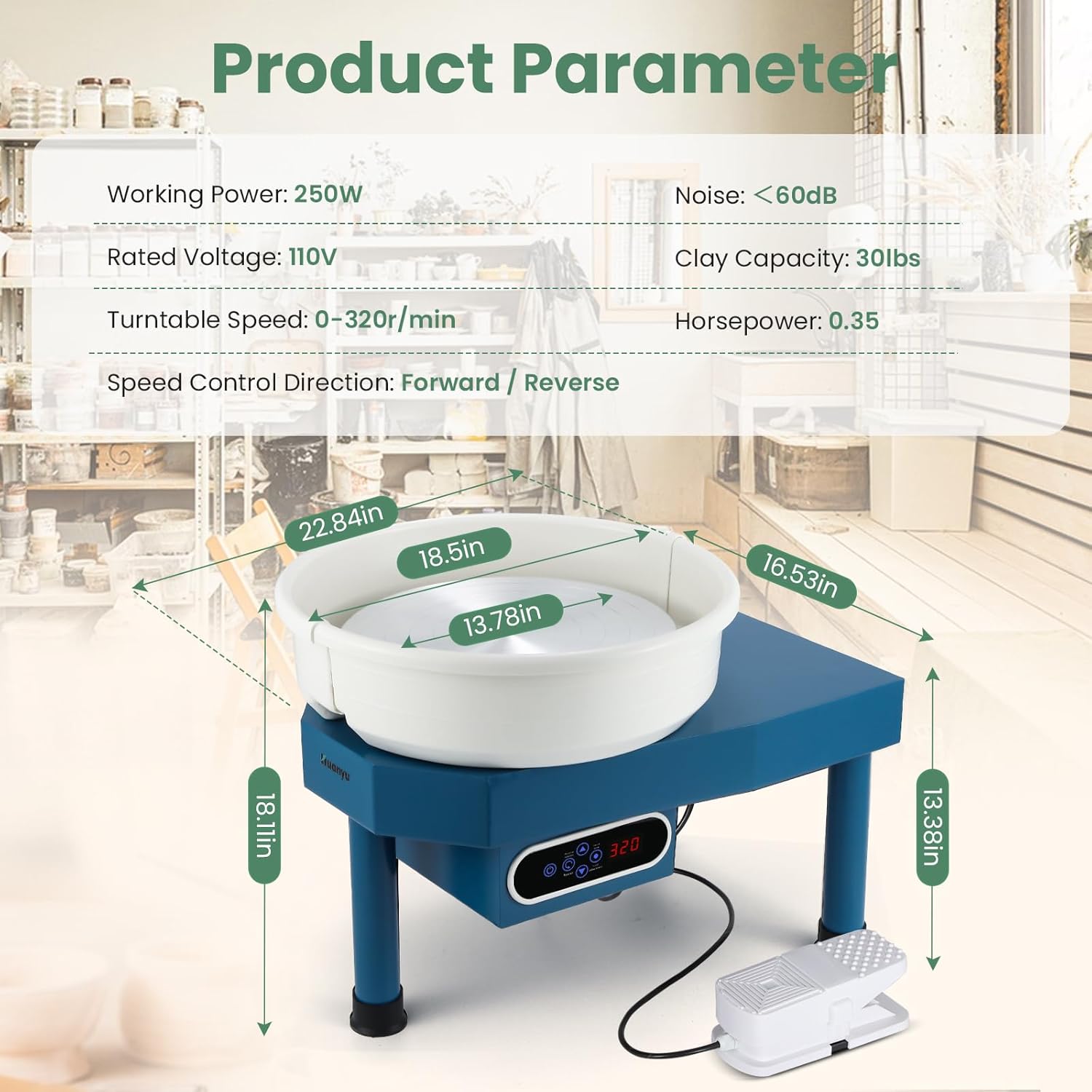 Flexible operation with lcd/pedal speed control: The speed of the pottery wheel forming machine is adjustable through the lcd touch screen or the foot pedal allowing potters to adjust the rotation speed based on their specific needs. Equipped with stepless speed regulation motor making it faster durable and low noise. The speed range is 0-320 rpm the minimum speed is 60 rpm