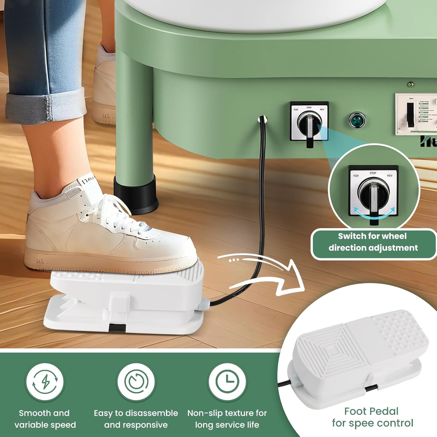 Well-made potter's wheel: The pottery wheel with aluminum alloy turntable & bright finish body scratch-resistant and wear-resistant. Thickened foot pads for non-slip and stable placement