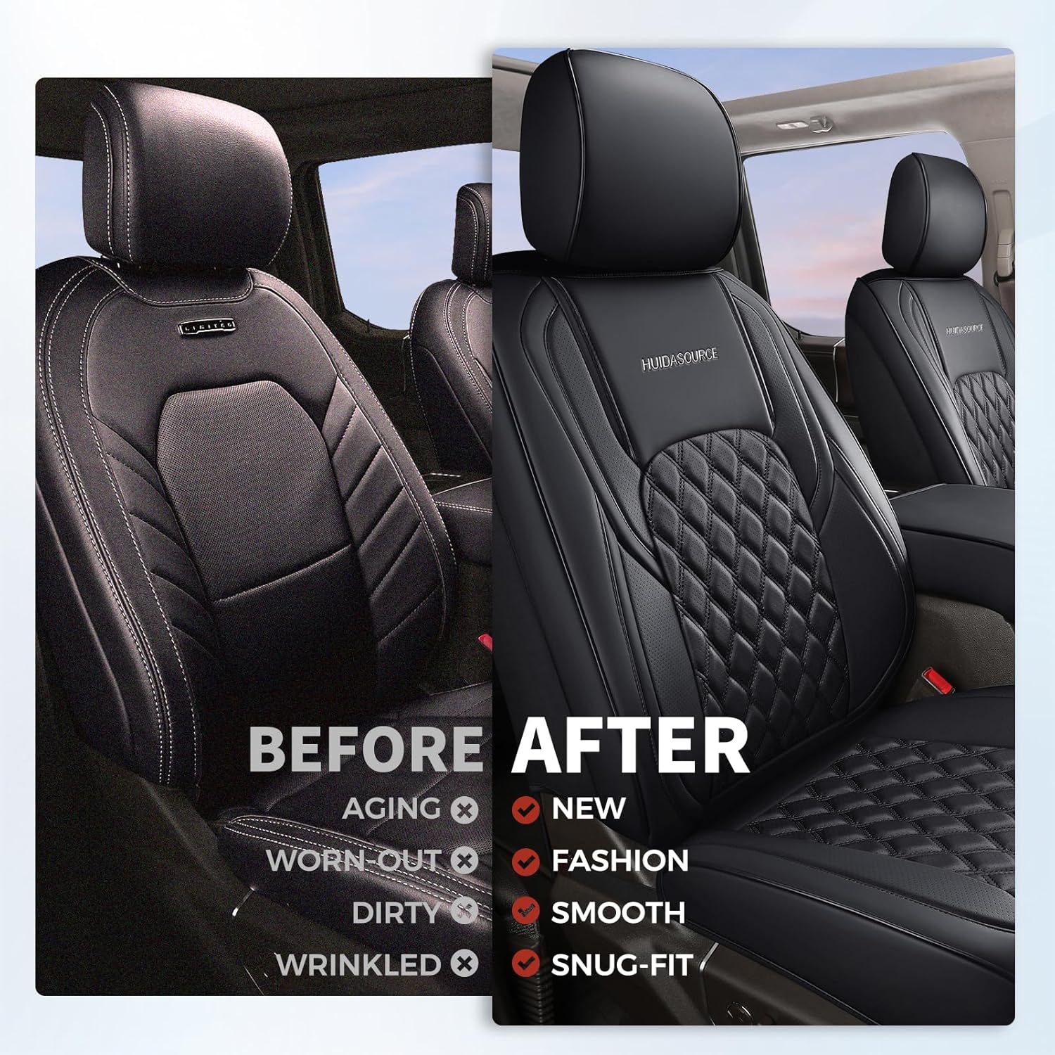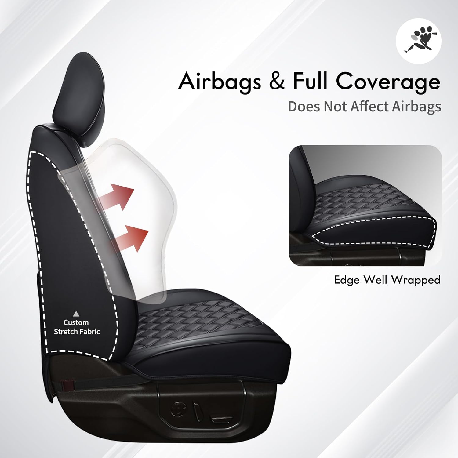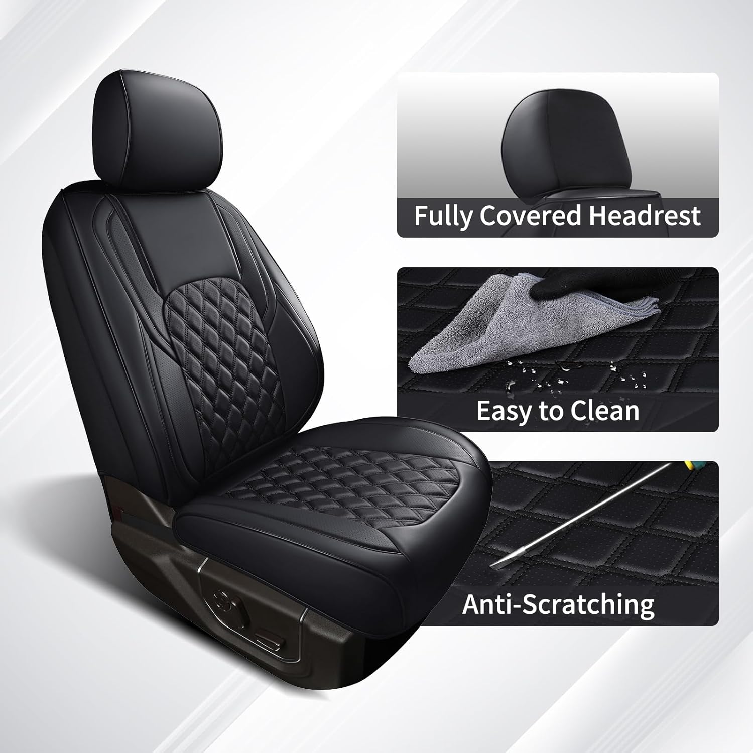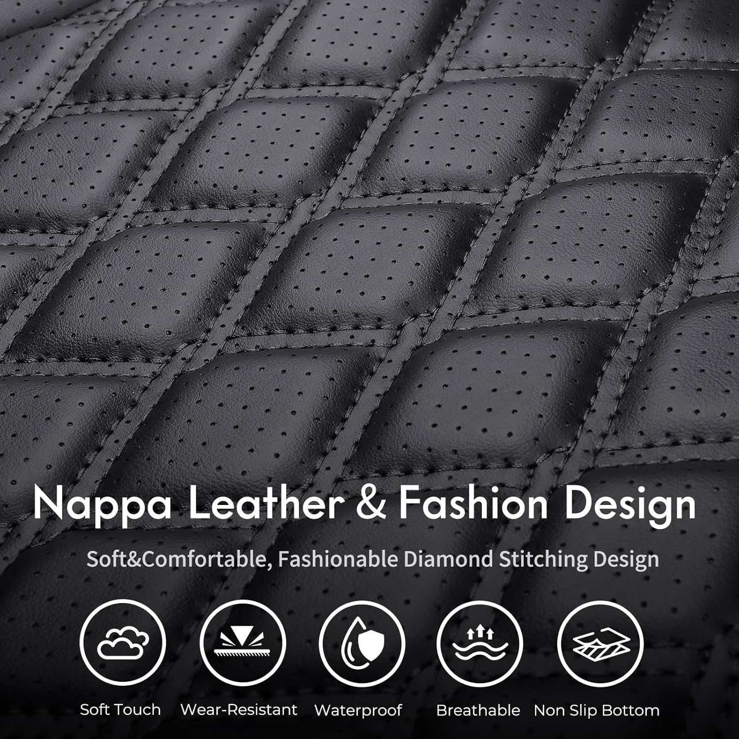 Stylish Design -- Wrangler waterproof leather seats covers are perforated in the center more breathable and stylish. Simple and unique 3D diamond design adds a stylish touch to your truck seats. With an all-inclusive design these seat cushion completely wraps the car seat without revealing the sides protects the seat more comprehensively