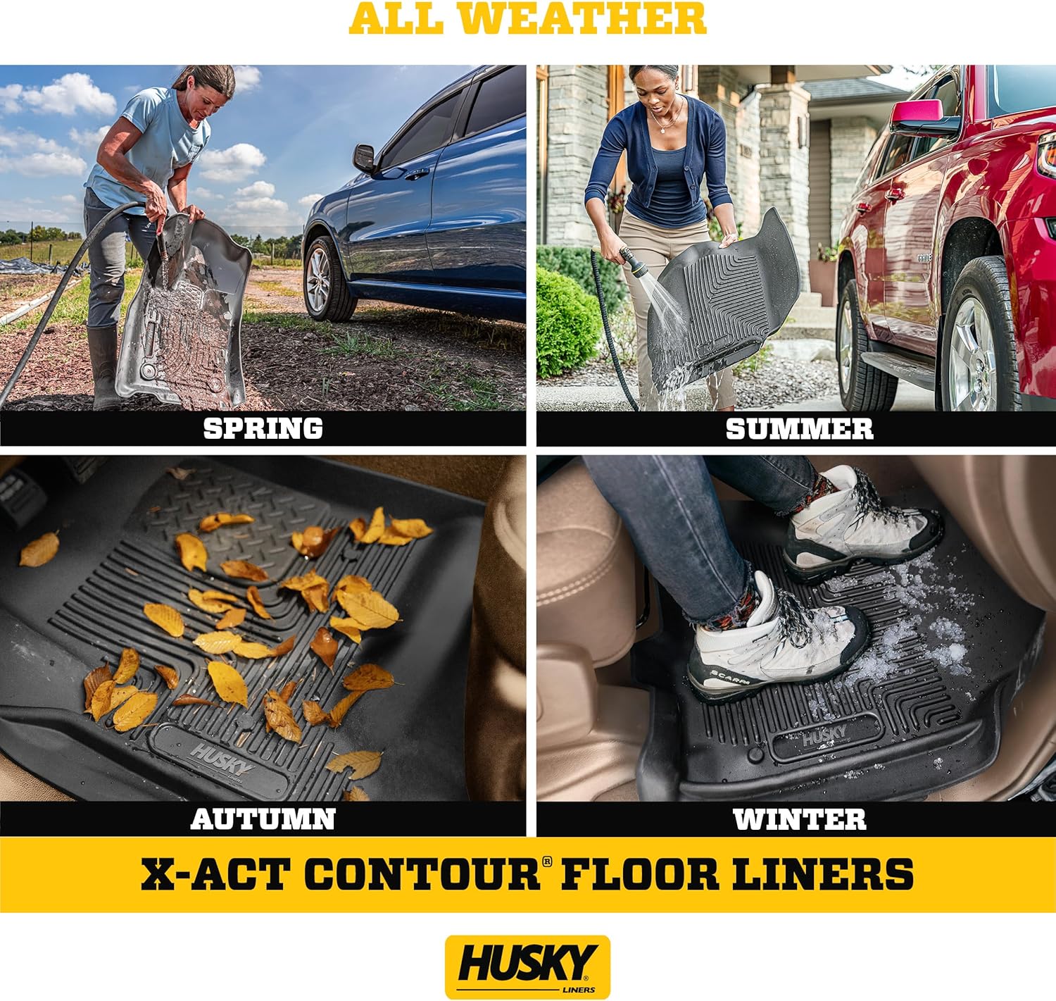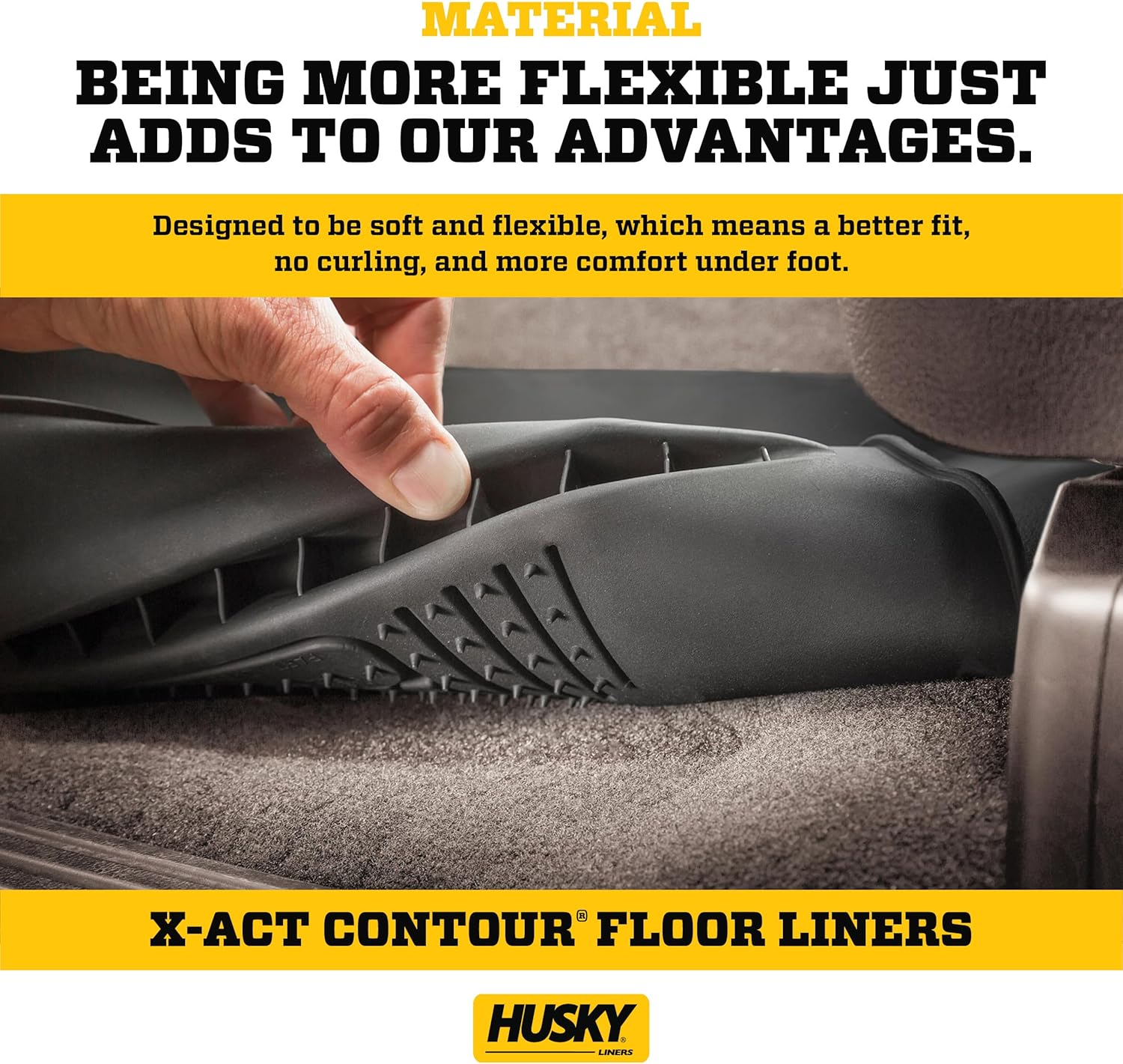 EXACT FIT WITH A NO-SLIP DURAGRIP SURFACE AND A SOFTER FEEL Toughness never felt so soft or fit so well. X-act Contour gives your truck van or SUV that factory look with comfort and stability no other liner can match. Its precise no-slip DuraGrip construction is warrantied for life. Nothing fits your vehicle better or protects longer than Husky X-act Contour. These liners combine laser-scanned exact fit with a no-slip DuraGrip surface and a softer feel. Plus the rock-solid stability delivered by your vehicles factory retention posts and our Stay-Put Nibs means a no-slip no-slide surface with absolutely zero compromise in protection. Theyre built to stand up to whatever youre laying down from muddy cleats to leaking groceries with our FormFit Edge to keep whatever spills contained for easy cleanup. Available in black gray or tan. Built for a lifetime of high performance warrantied the same. Proudly made in the USA.