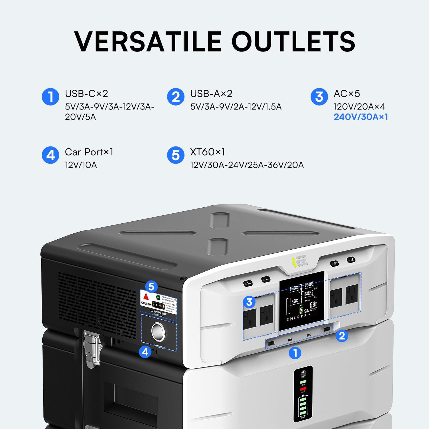 IEE SP5000 solar power station can be expanded to meet your needs from 5120Wh to 10240Wh with up to 4 BP3600 batteries. Each battery pack has a capacity of 2560Wh. Whether you're dealing with a power outage at home saving money on your energy bills or living off the grid the SP5000 power generator will provide you with more reliable power.