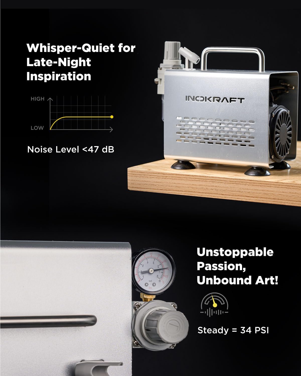 Quiet Stable and Powerful Air Compressor: Featuring a 1/6 HP compressor (120v 60Hz) with a steady 34 PSI output this airbrush kit delivers consistent results even during long sessions. With an adjustable pressure valve and noise level under 47 dB it's quiet enough for late-night creativity. Includes an oil-water separator airbrush holder stable suction base and portable handle.