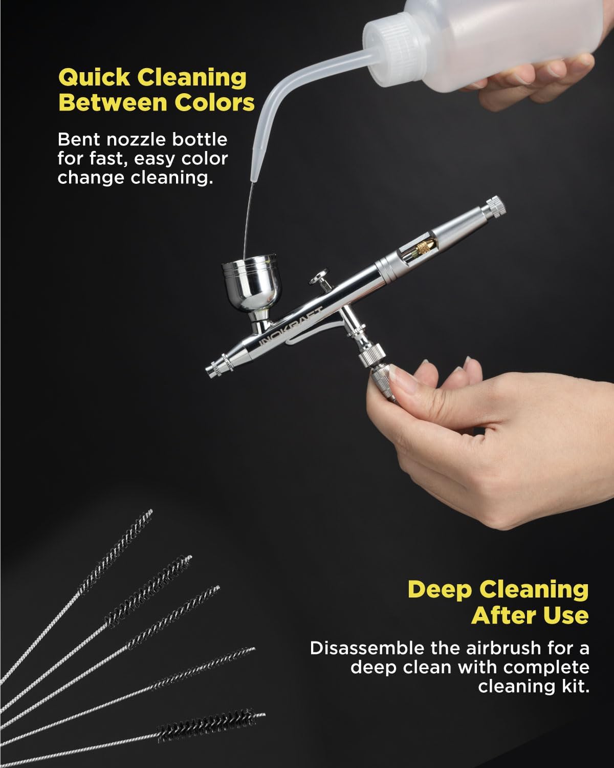 Easy to Clean: Airbrush kit includes a full set of cleaning tools for effortless maintenance. Enjoy quick cleaning during use with the bent nozzle bottle for fast easy transitions. After your project disassemble the airbrush for a deep clean using our comprehensive cleaning kit. Simple to clean so your creativity never stops!