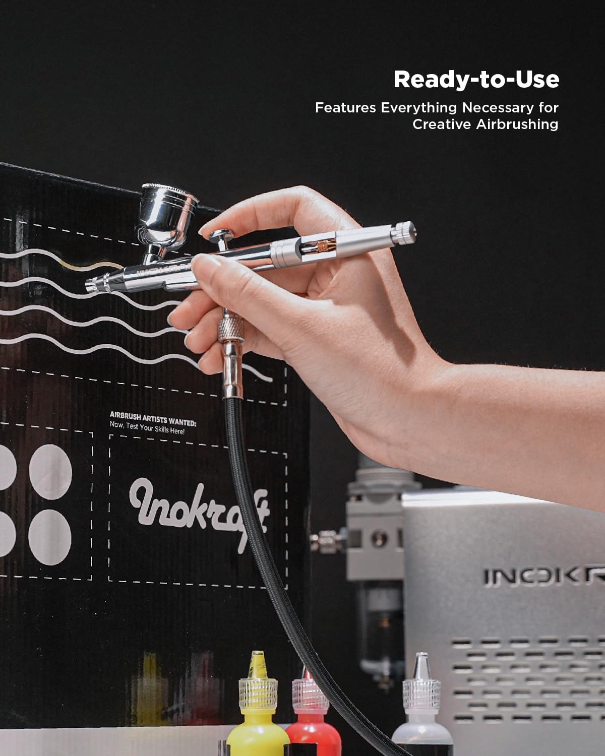 3 Nozzle Sizes Airbrush for Versatile Painting: Airbrush Set includes 3 nozzle sizes: 0.2 mm for fine detail 0.3 mm for general use and 0.5 mm for larger areas. Achieve smooth finishes and superior coverage with high-quality atomization. The dual-action airbrush lets you control air and paint flow with ease offering flexible painting with one finger.