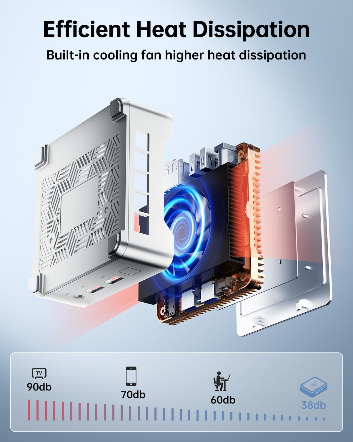 HIGH-SPEED COOLING SYSTEMThis feature-rich micro PC includes: 1x Gigabit Ethernet 2x USB 3.2 Gen2 Type-A 2x USB 2.0 Type-A 1x HDMI 2.0 1x DP 1.4 1x DC IN 1x 3.5mm Audio. Connect all peripherals easily. The micro mini computer works flawlessly with servers monitors projectors TVs and office gear. Built-in intelligent fan cooling system ensures stable operation under heavy loads (dual exhaust ports + large-area heat sinks near-silent operation at low loads)
