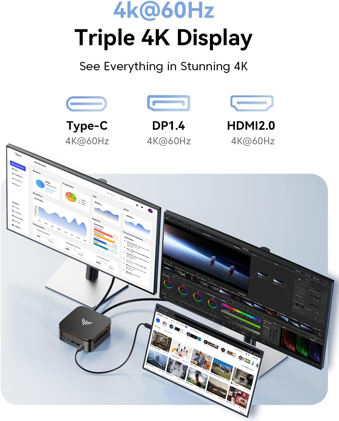 Triple 4K Display Support Not Just Dual: Why settle for dual monitors when you can go triple 4K? The Pinova P1 Mini Desktop PC delivers what most entry-level mini PCs cant: simultaneous output via HDMI 2.0 DisplayPort 1.4 and USB-C (with DP Alt Mode). Powered by AMD Radeon graphics (up to 1.4GHz) it offers 34 the graphics performance of UHD integrated solutions making multi-screen productivity or immersive entertainment truly seamless