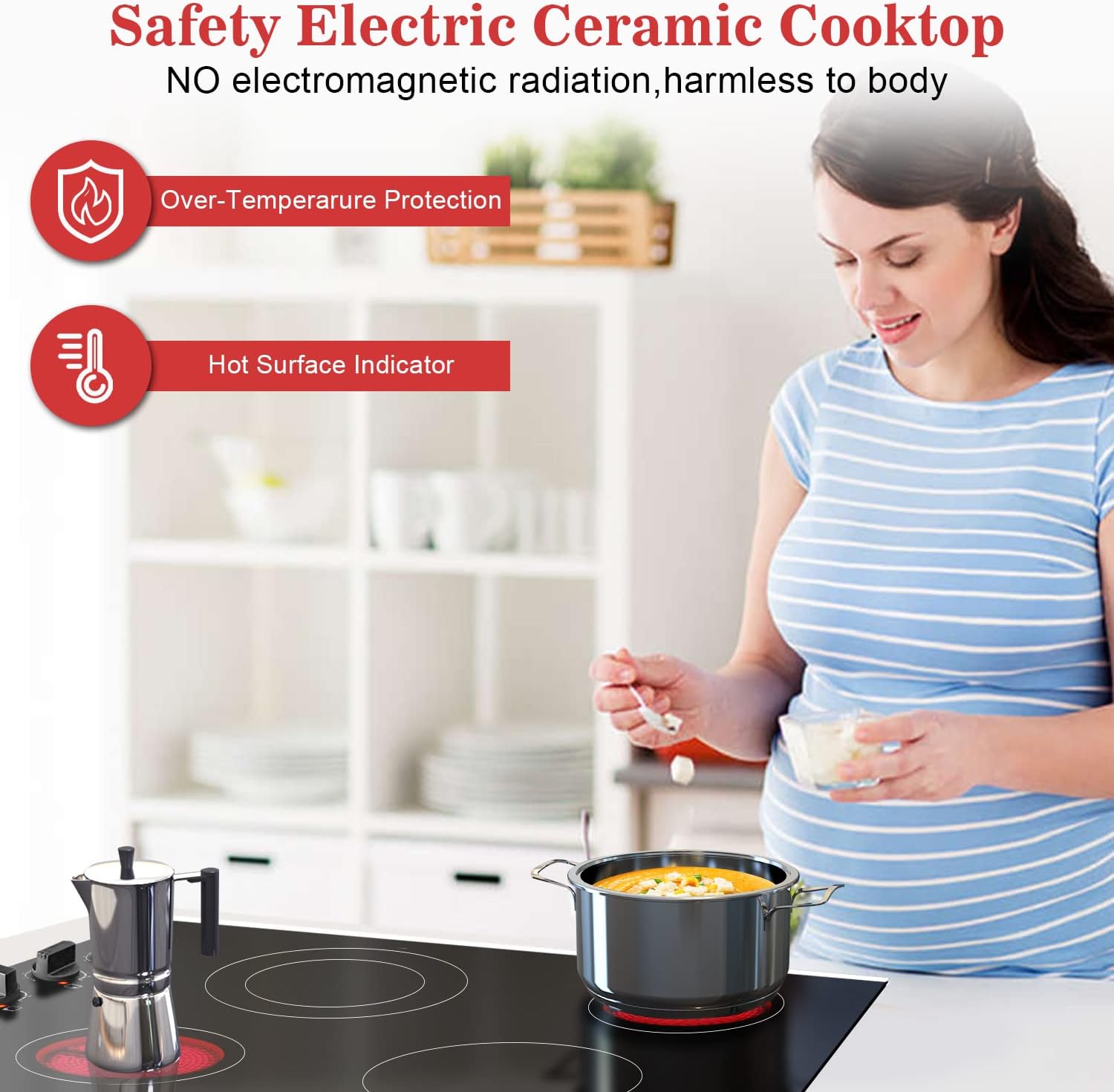 Safe radiant electric cooktop The 30 inch cooktop is specially designed for safety having various safety protection functions such as hot surface indicator which remind you that the temperature is too high; Over-temperature Protection automatic safety shut off function when it detects that the internal temperature of the 30" electric stovetop is too high it will automatically shut down. This kinds of ceramic cooktop has no electromagnetic radiation is harmless to the human body.