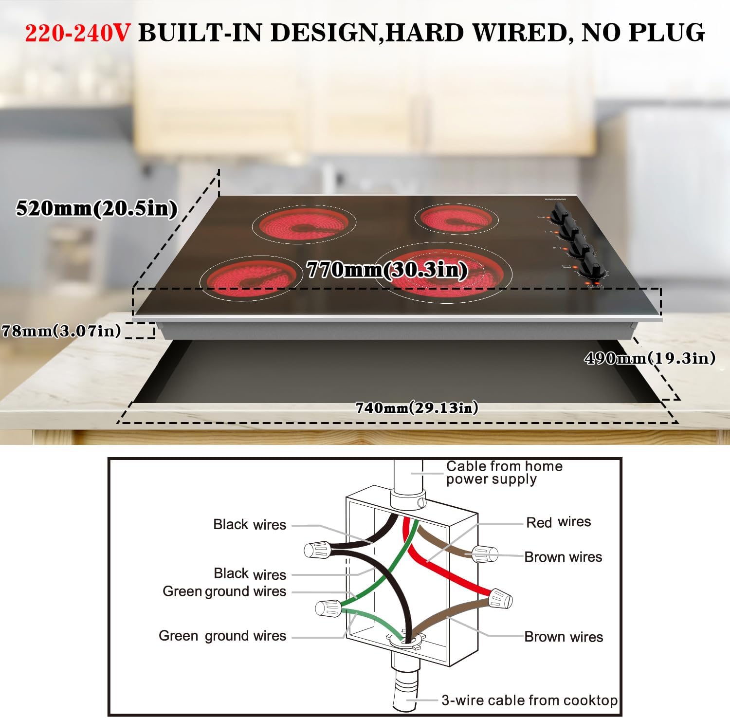 9 Power Setting & 220v-240v Electric CooktopThe 30" ceramic cooktop equipped with 4 powerful burners:1200W+1200W+1800W+1250/2500W(Dual). Every burner of the drop-in electric cooktop has 9 power levels rotating the Knob to contrtol the power from 0-9 levels perfect for braise fry deep fry stir-fry roast and more.Built-in electric cooktop requires professional wiring to 220-240V NO plug.