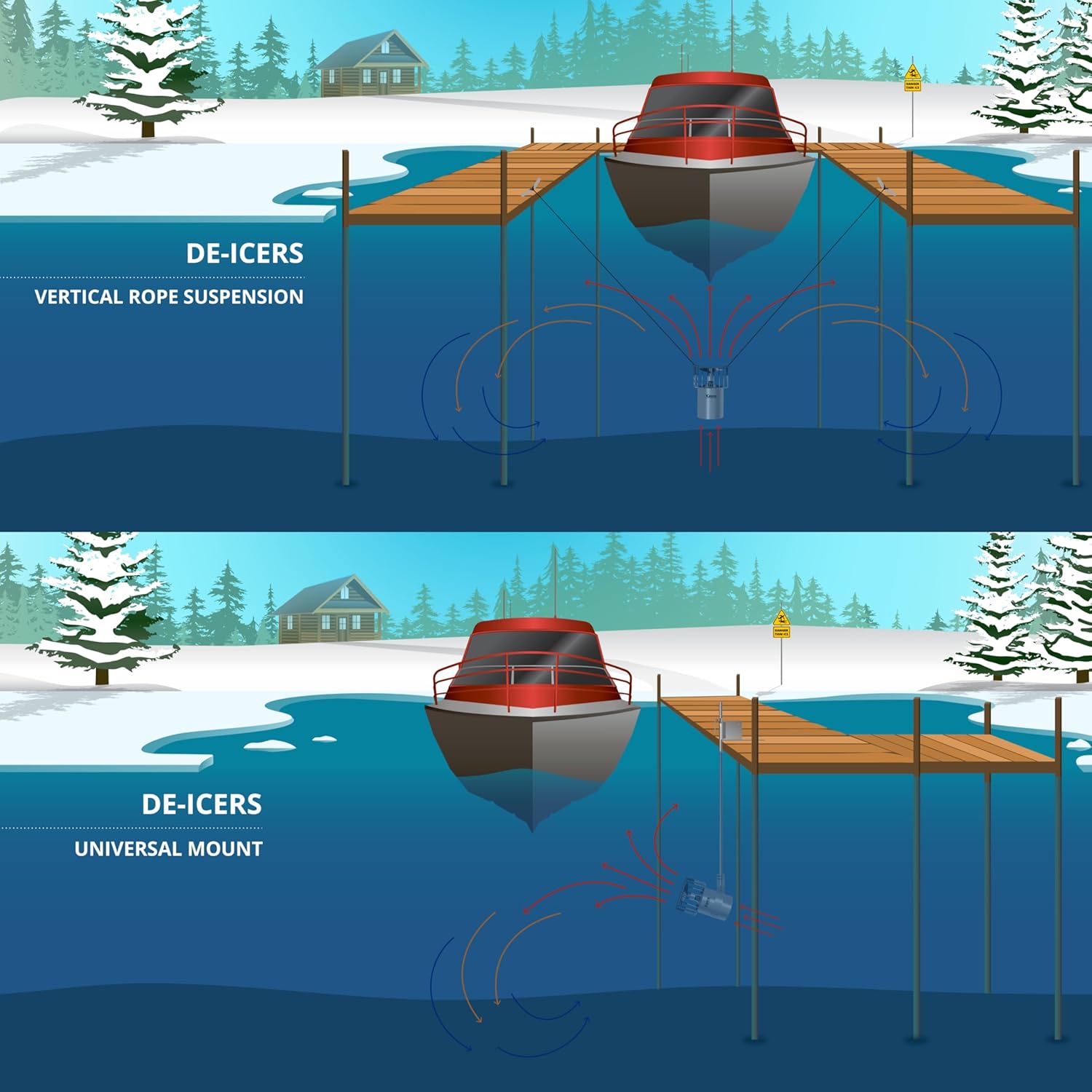 Protect Waterfront and Aquatic Life: By pushing warmer water up s De-icers create an opening at the waters surface keeping boats and docks safe from damaging ice buildup. Not only do De-icers protect your in-water property they also help keep fish and aquatic species healthy throughout the winter by allowing for open areas where oxygen can enter the water.