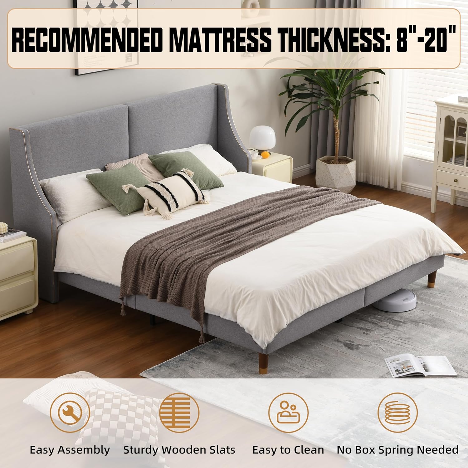 No Box Spring Needed: As an linen king bed frame with wingback headboard, it requires no box spring; This saves you money, time and effort, making it a convenient and economical choice for your bedroom setup