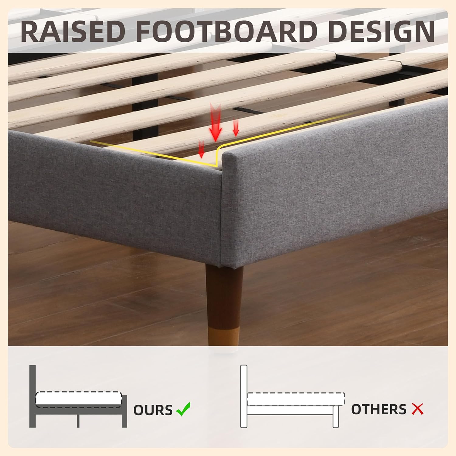 Breathable & Supportive Design: The upholstered bed frame king has evenly spaced wooden slats; This design promotes ventilation and keeping your mattress dry and durable; It also provides moderate elasticity to adapt to your body curves, relieves pressure, and enhances your sleep comfort
