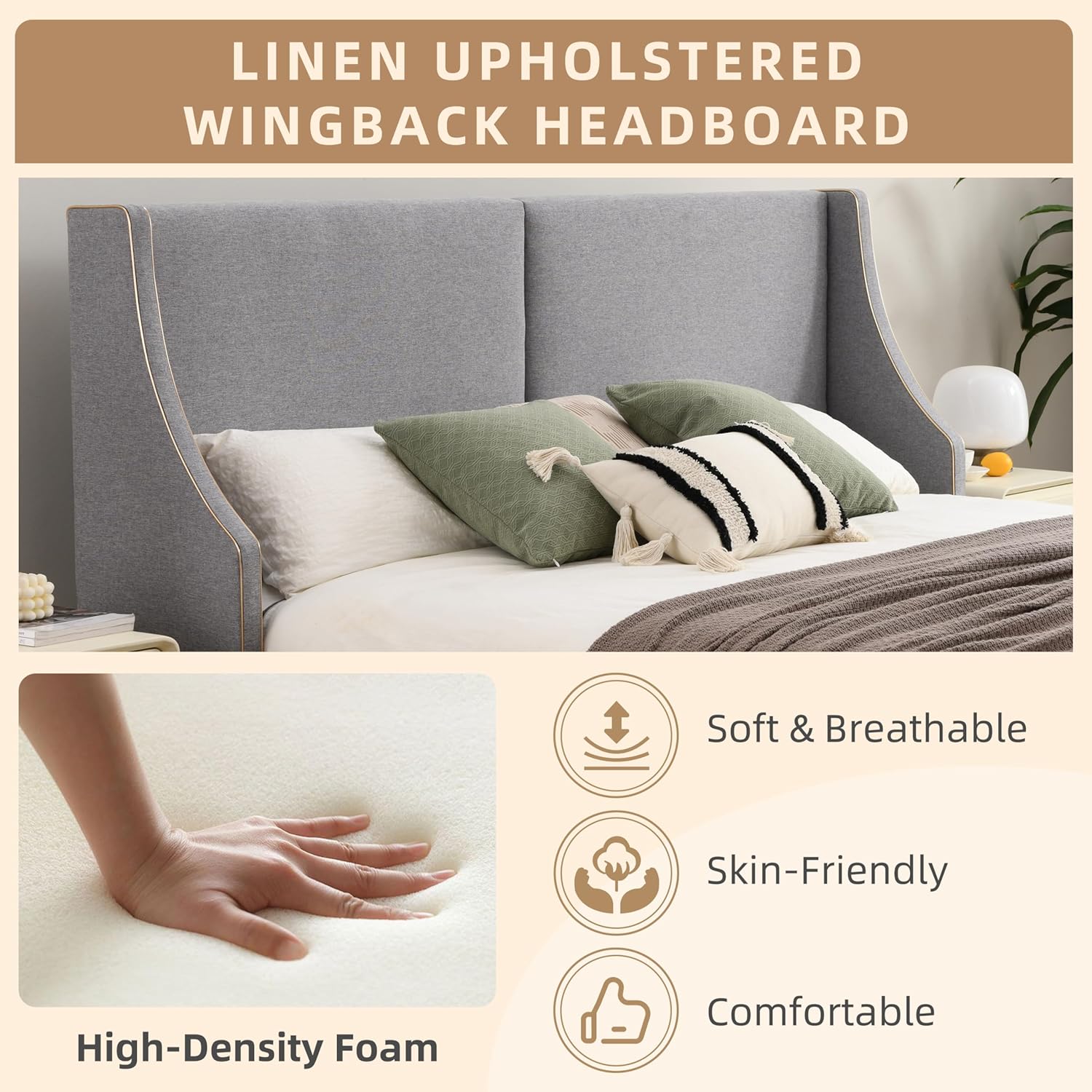Comfortable Linen: The king size headboard and bed frame is made of linen fabric and high - resilience foam; This combination provides a skin - friendly surface and exceptional comfort, allowing for optimal relaxation and rest