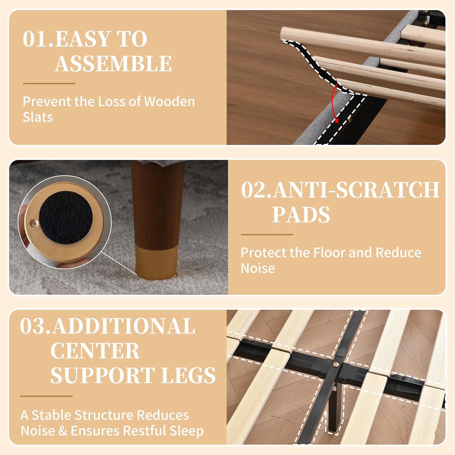 Sturdy & Noise-free Structure: This california king bed frames is built with 12 wooden slats with magic tapes and a sturdy metal frame, supporting up to 800 lbs; Combined with EVA soundproof pads, it ensures a quiet and stable sleep environment, so you don't need to worry about creaking noises