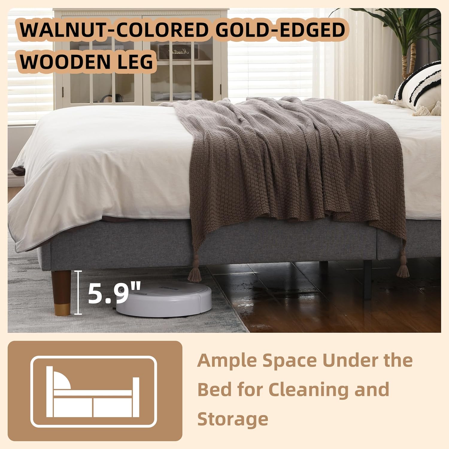 Exquisite Bed Feet Craftsmanship: The king bed frame's bed legs designed by a British designer with 30 years of experience, they feature a walnut color and gold - plated plastic; The anti - scratch pads on the bottom ensure no damage to your floors, adding a sophisticated touch to your bedroom