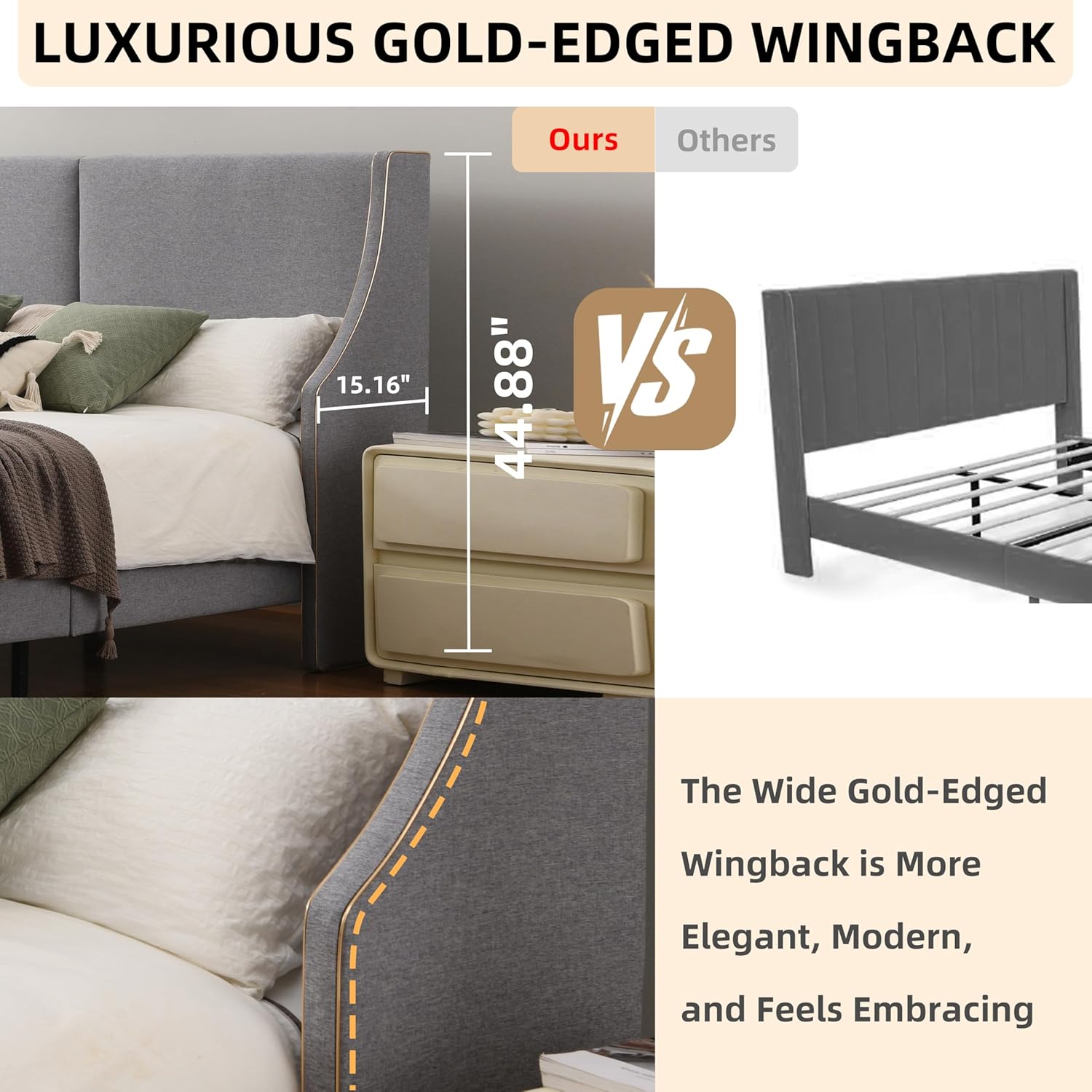 WHY CHOOSE ? This bed's gold-edged wingback design exudes luxury and grandeur; With top - quality materials and a robust structure, it's definitely worth the investment; You can also visit our store, which offers a wide range of bedroom furniture; If you have any questions, feel free to contact us at any time