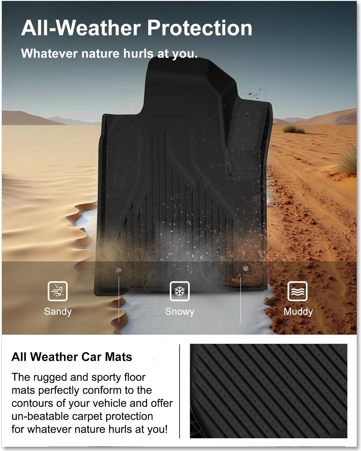 All Weather Protection: Rugged and sporty floor mats perfectly conform to the contours of your ride and offer un-beatable carpet protection for whatever nature hurls at you