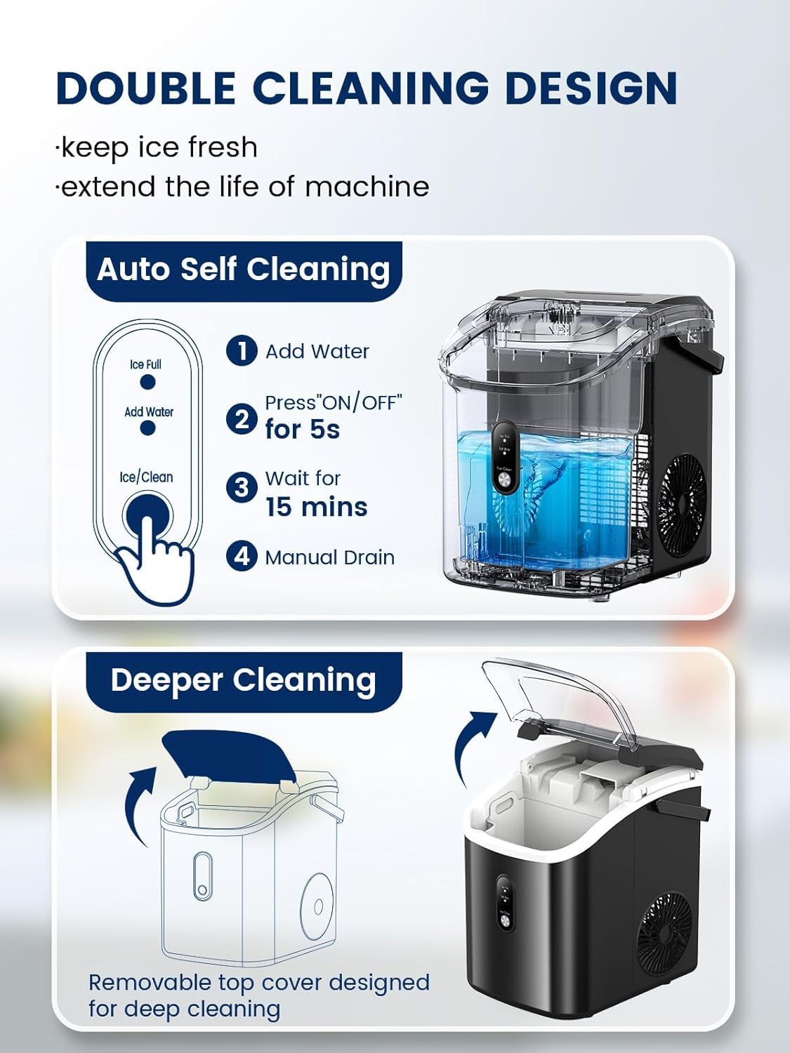 Self Cleaning Ice Maker: Press ICE/CLEAN button for 5 seconds the ring indicator light flashes white. The countertop nugget ice maker will run the self cleaning procedure for 15 minutes and automatically exit. Press this button again during the cleaning procedure the ice maker will exit immediately. You can enjoy healthy and fresh pellet ice cubes at any time. We suggest washing the nugget ice machine before long-term storage and ensuring it is dry inside
