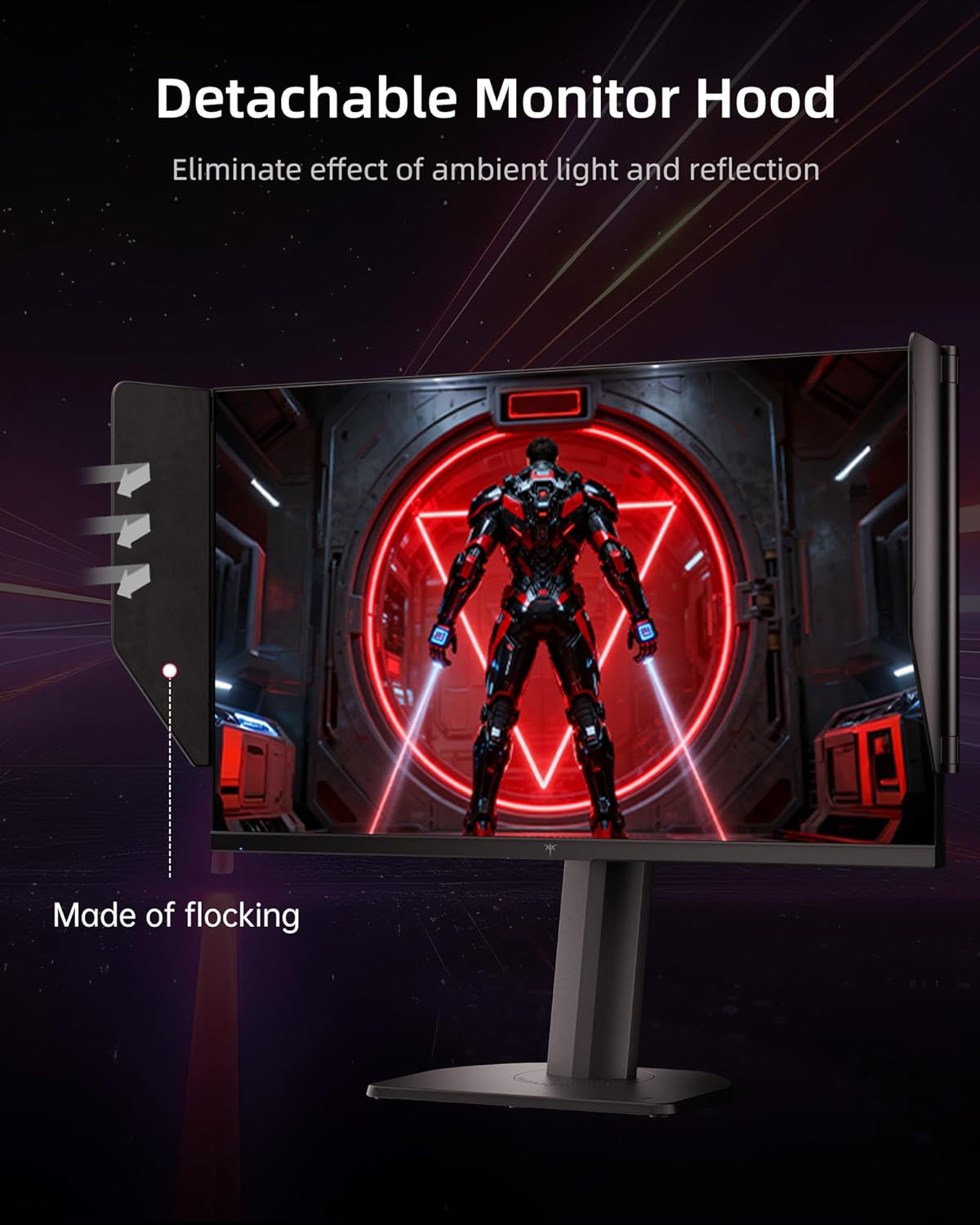 Monitor with Shielding HoodThe flocking material on the inner bezel of the monitor helps completely eliminating frame reflections by absorbing light thereby enhancing visual immersion and image contrast which also provides a soft texture and certain sound-absorbing effects.
