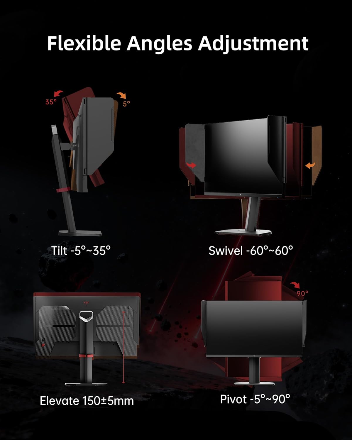 Comfort & Adjustability: The low blue light and flicker free enables you keep eye health and comfort during prolong use. The ergonomic design supports height adjustment 1505mm tilt -5~35 swivel -60~60 pivot -5~90.