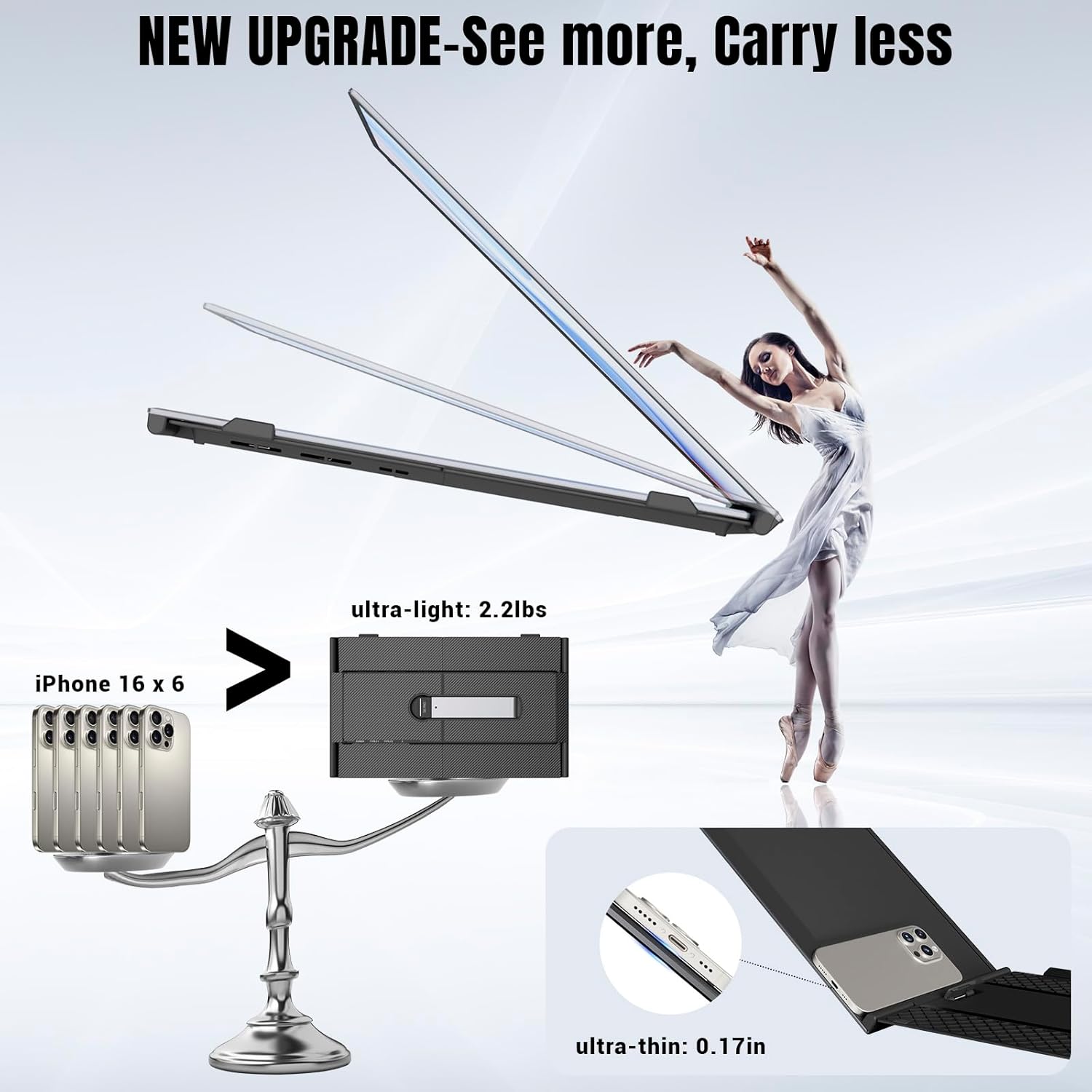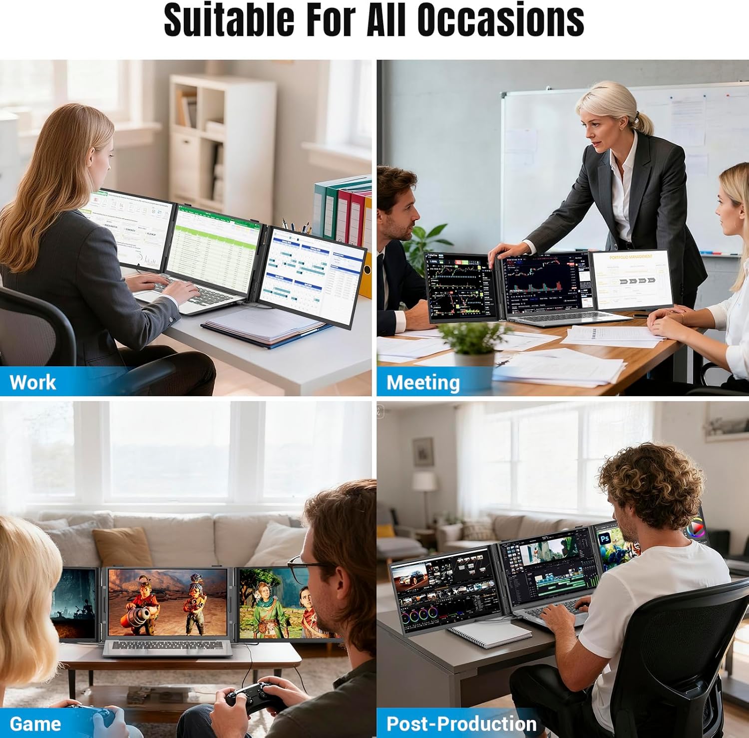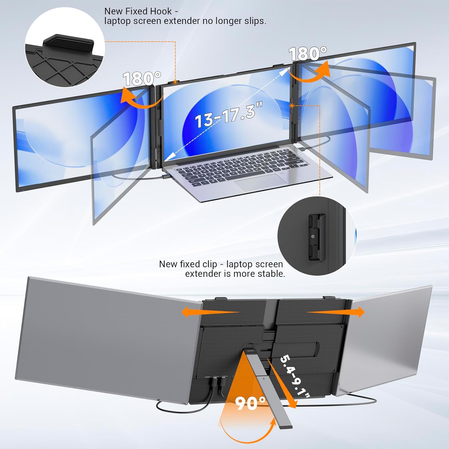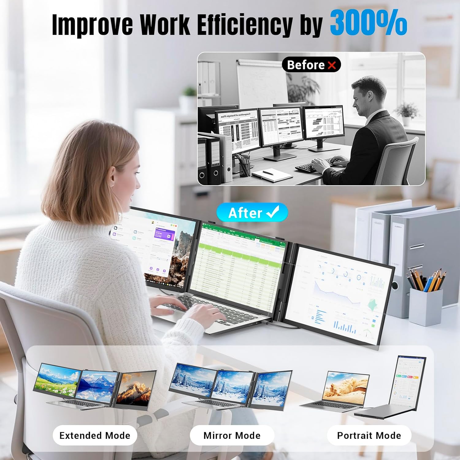 Improve Efficiency up to 300%The laptop monitor extender supports multitasking on different screens simultaneously eliminating the need for frequent switching on a single laptop screen and improving efficiency by up to 300%. The pc monitor supports three modes: Extended Mode Mirror Mode Portrait Mode. It is ideal for video conferencing presentations office work video editing playing games or travelling.