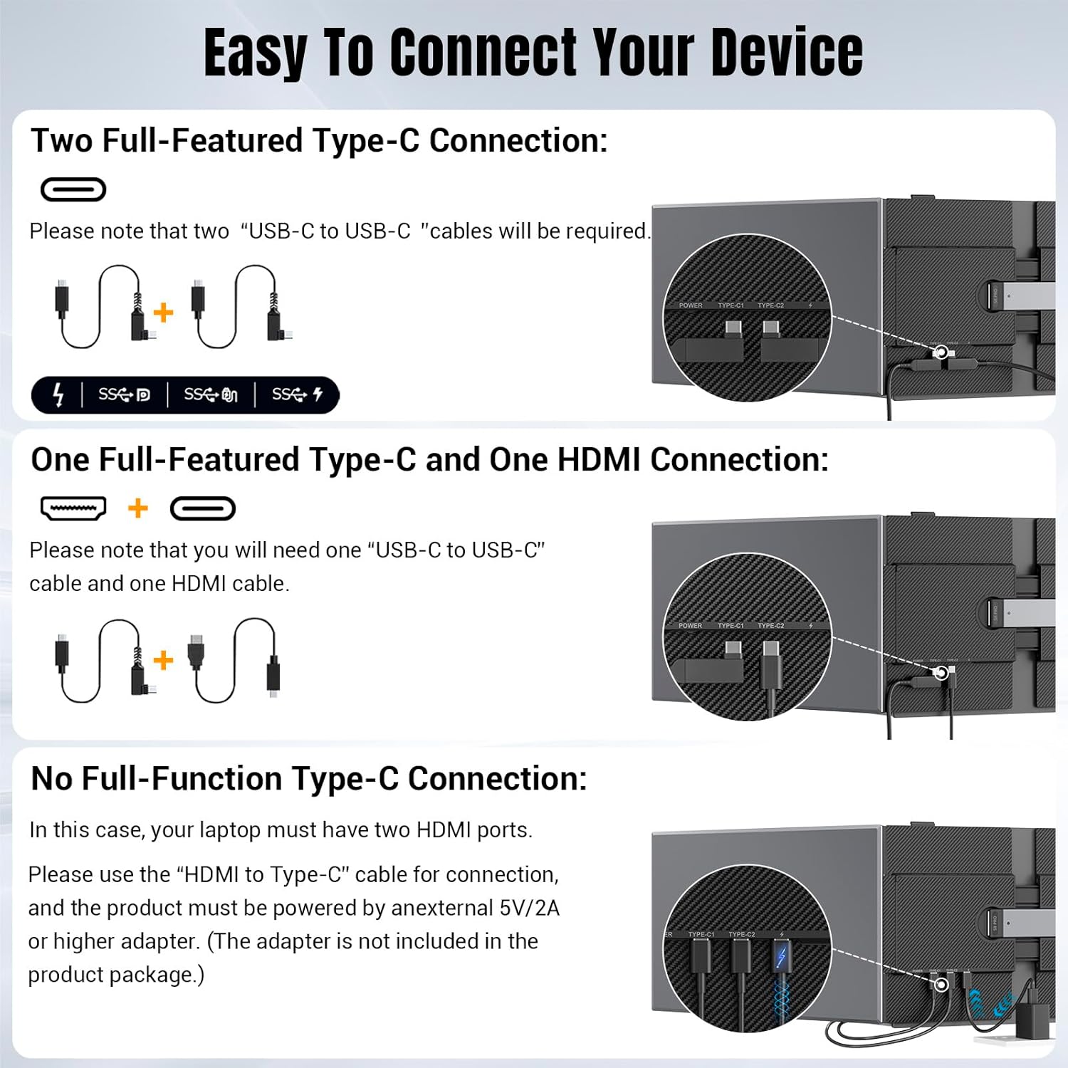 Plug & Play Easy to connectThere are no extra cables to be connected to the triple monitor for laptop. If your laptop has two fully functional Type-C ports you only need two USB-C cables to connect. If your laptop has one fully functional Type-C port you need two cables to connect: one USB-C and one HDMI. If your laptop does not have a fully functional Type-C port you need two HDMI cables to connect but need to be powered by an external 5V/2A or higher specification adapter.