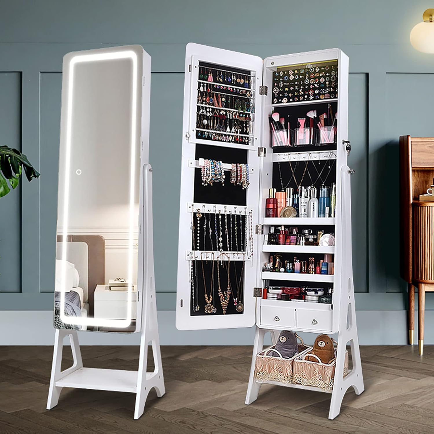 【Can the jewelry case lock?】Lockable mirror door helping you find the jewelry you want quickly. Using this locker to keep your jewelry together and safe from missing.