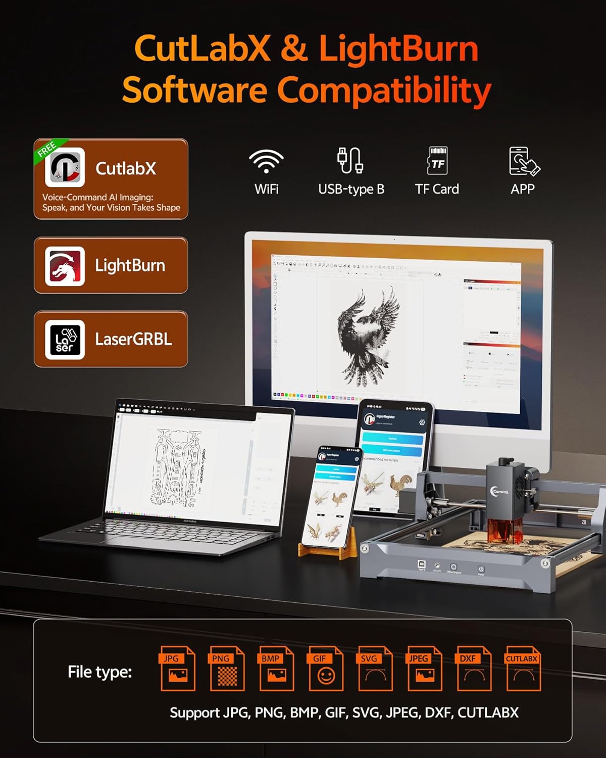 User-Friendly No Hidden Costs: Includes our CutLabX app (works with Windows Mac Android iOS) with no subscription fees plus compatibility with LightBurn and LaserGRBL. The beginner-friendly starter kit comes with safety glasses test materials and tools with 90-second setup (just 6 screws no tedious belts). Important: Please install the driver first. The driver is stored in the TF card pre-installed in the machine. To remove the TF card gently press it in and it will eject automatically.