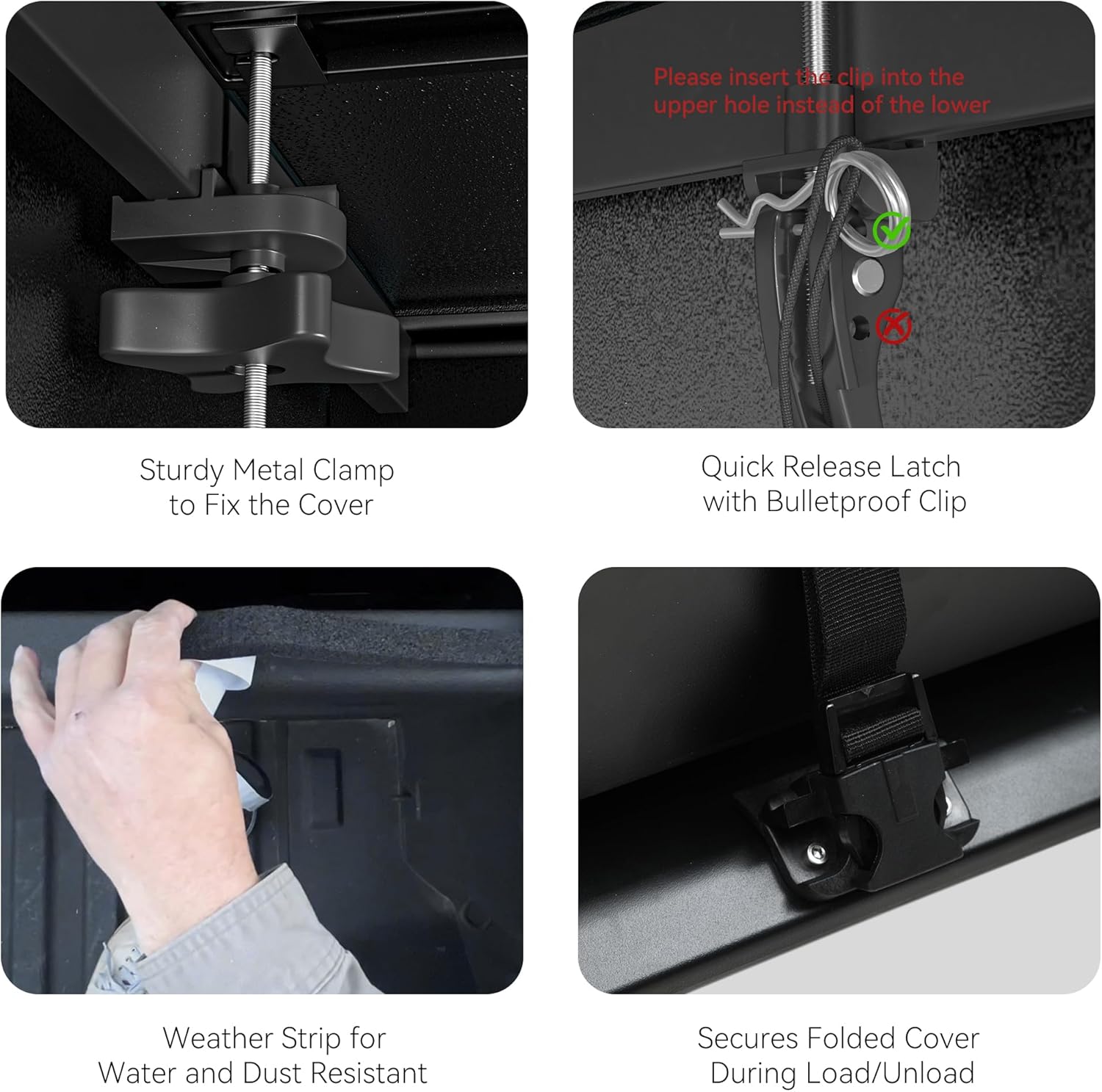 Easy Installation: truck bed cover can be securely installed without causing any damage to your vehicle using a full set of fixtures; The upgraded anti-bullet design of the clamps ensures driving safety