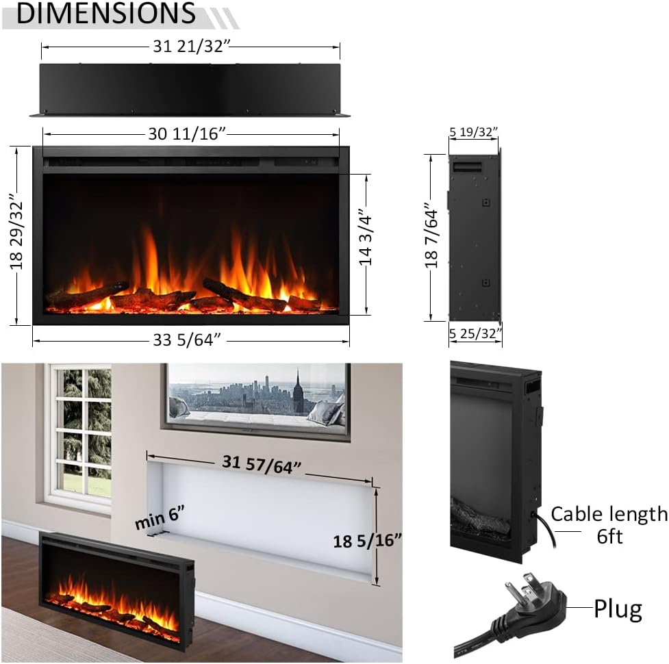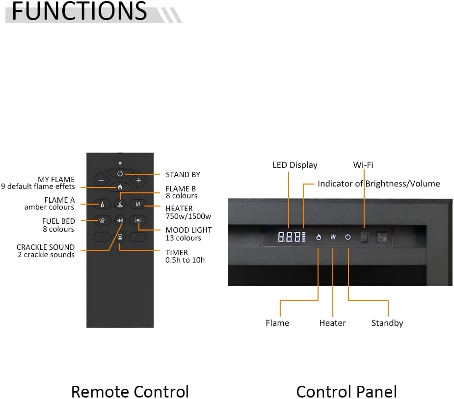 MULTI FLAME COMBINATIONS: The modern and realistic flame creates a life-like flame feel; Including both options for fuel bed: Log set and crystal stone. Multi color flame and fuel bed in 5 brightness settings, crackling sounds to suit your different moods cheerful or peaceful in different occasions. Flame and crackling effect can be used with or without heat.