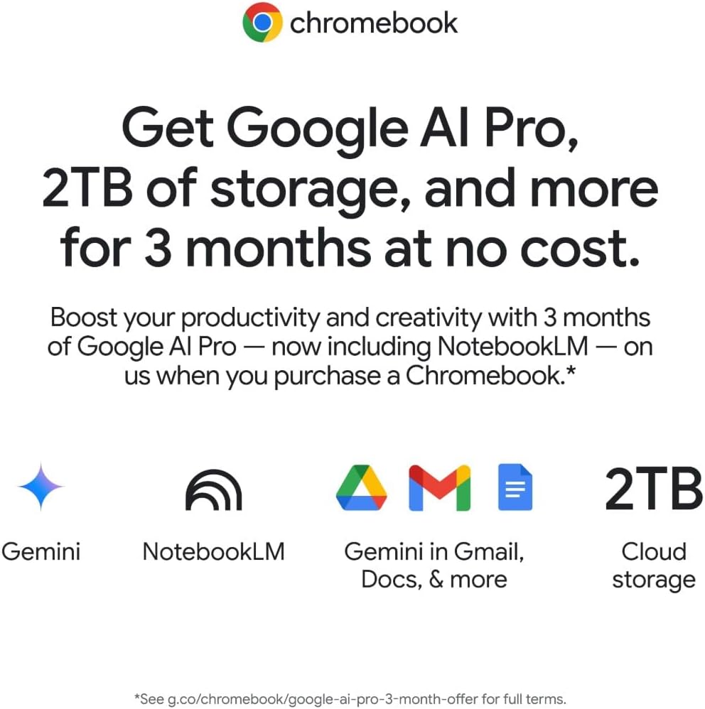 GET GOOGLE AI PRO 2TB OF STORAGE AND MORE FOR 3 MONTHS AT NO COST Boost your productivity and creativity with 3 months of Google AI Pro now including NotebookLM on us when you purchase a Chromebook.(1)