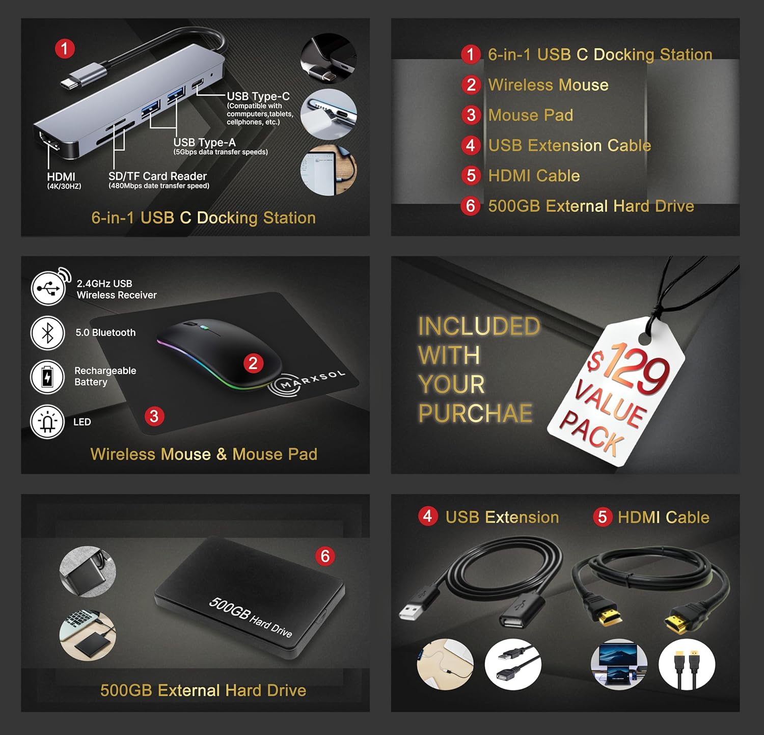 Accessory: MarxsolAccessory (Rechargable wireless earbuds 500GB External Drive USB extension cord HDMI cable mouse pad and wireless mouse)