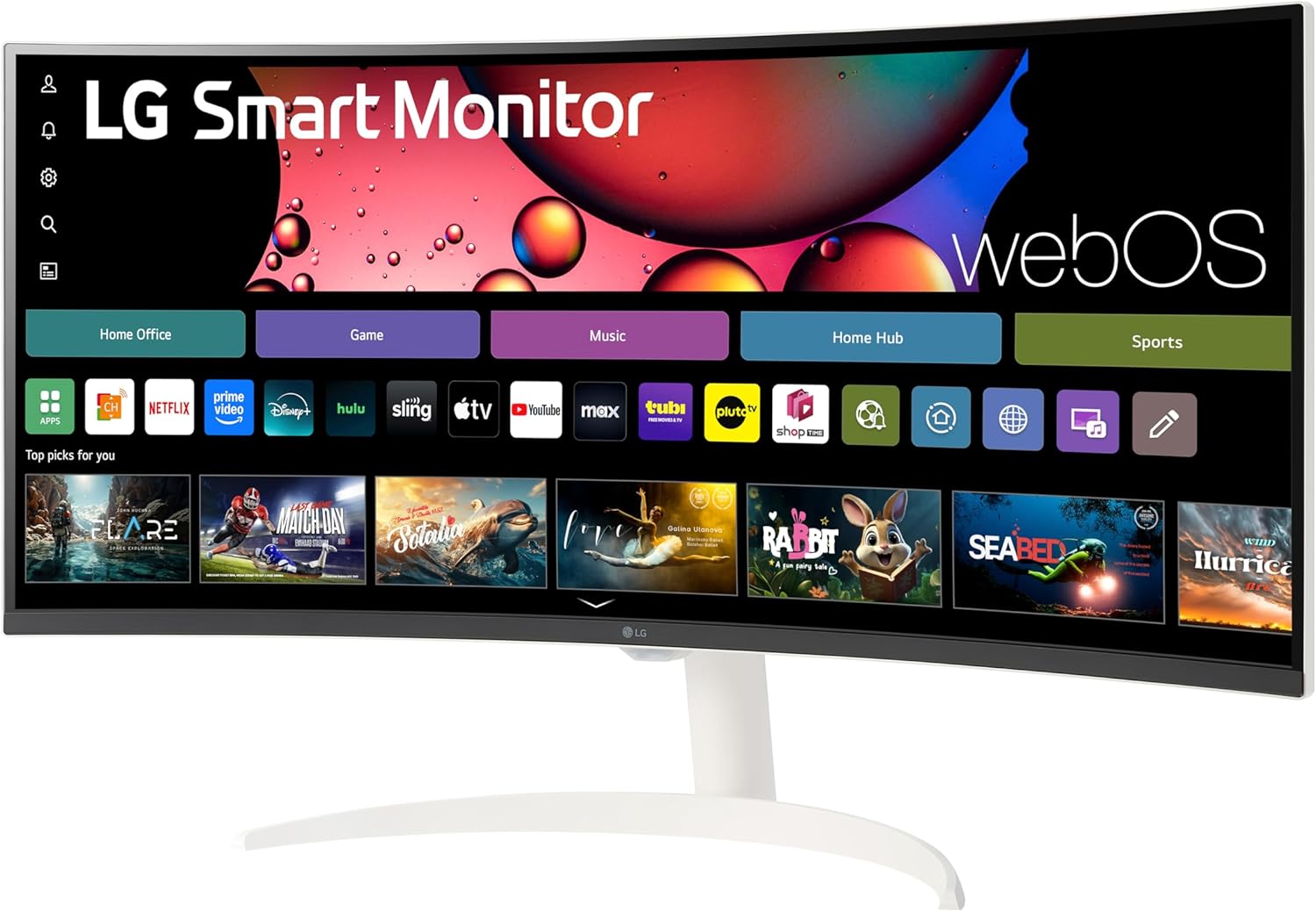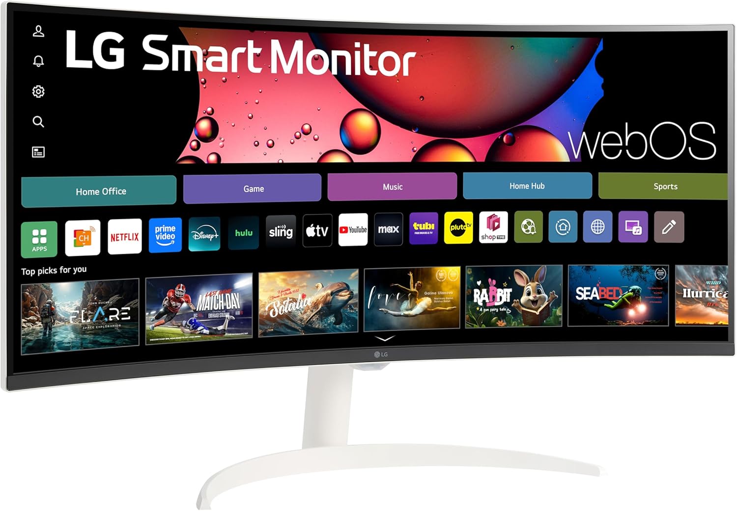 One screen. Endless possibilities. The 21:9 ultra-wide 34 curved Smart Monitor offers stunning widescreen visuals and a sleek design that's perfect for work play cinematic viewing and everything in between. Experience vivid color with up to 99% sRGB color gamut expression and impeccable clarity with the 21:9 WQHD (3440x1440) screen bringing every detail to vivid life. Thanks to streaming platform webOS23 find your streaming favorites fast with built-in access to Netflix Prime Video the Apple TV app Disney+ HBO Max and instant access to over 300+ free Channels with everything from comedy to movies to sports. Apple AirPlay 2 & HomeKit compatibility allow you to wirelessly control your monitor plus cast and mirror content from iOS or MacOS devices no Apple TV necessary. Gaming on the monitors wide screen with the 100Hz refresh rate assures ultra-smooth action. Internet connection and subscription to streaming services are required. Internet connection and subscriptions to streaming services are required. Amazon Prime Video and all related logos are trademarks of Amazon.com Inc. or its affiliates. Amazon Prime membership and/or Prime Video fees apply. See primevideo.com/terms for details. HBO Max 2023 Warner Media LLC. All Rights Reserved. HBO Max is used under license. Number of Channels subject to change. Home Office services support only Microsoft 10 and 11 or higher. Microsoft 365 and Google registration and subscriptions may be required. Separate services may require payment for subscription. Supported service may vary by country. Your Apple device must be connected to the same Wi-Fi network as your monitor. Apple the Apple logo AirPlay Apple TV and HomeKit are trademarks of Apple Inc. registered in the U.S. and other countries. This Smart Monitor supports AirPlay 2 and requires iOS 12.3 or later or macOS 10.14.5 or later. Internet connection and subscriptions to streaming services are required for streaming services. Keyboard and mouse available separately.