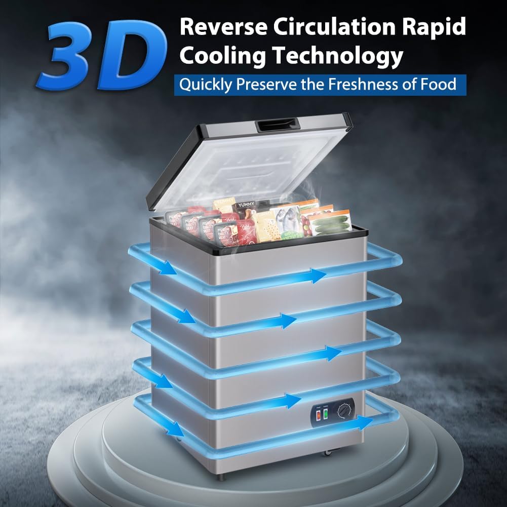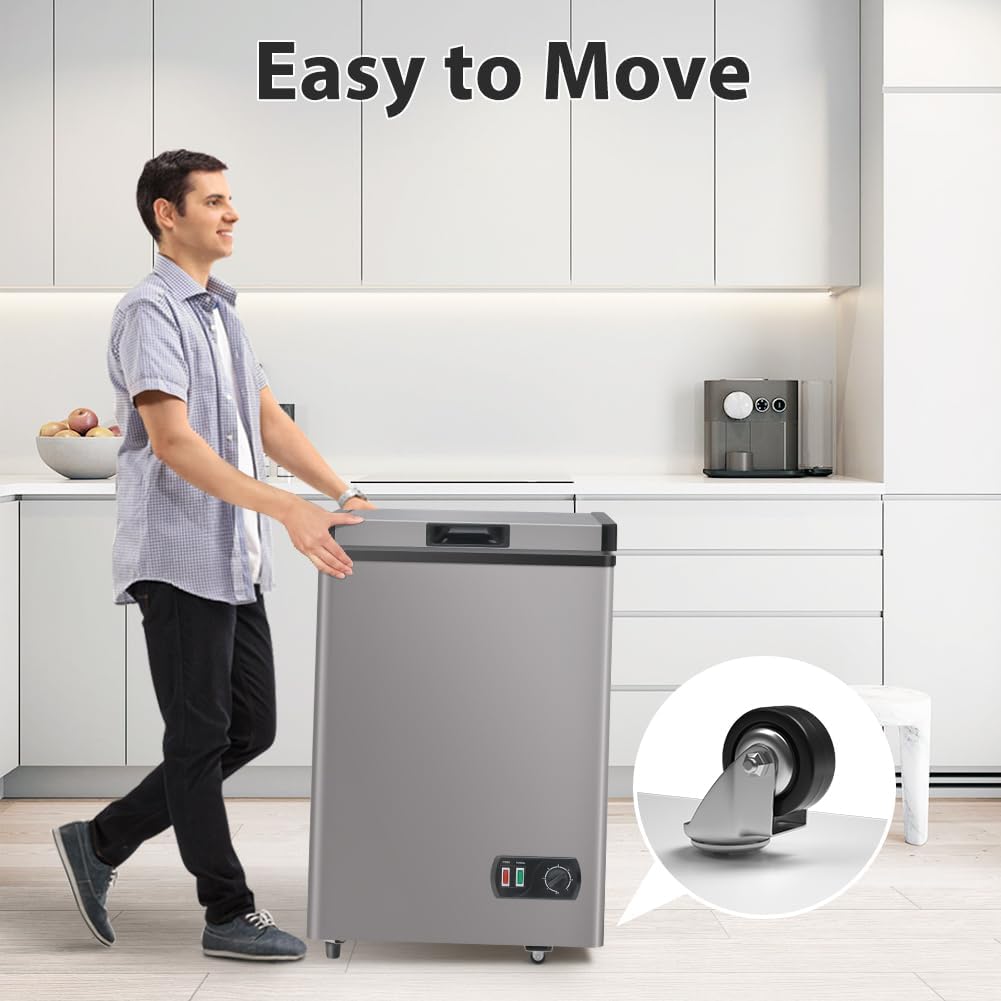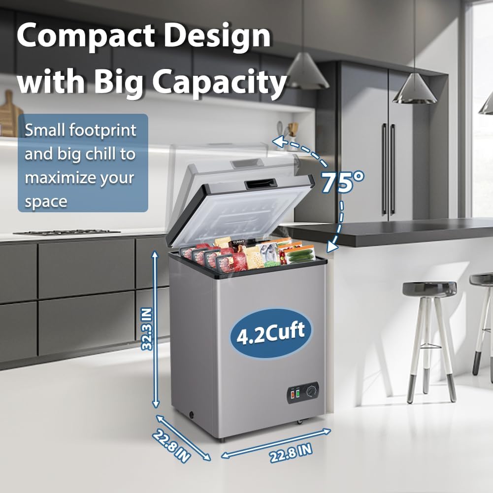 Compact Design with a Big Capacity:The space-saving design of this 4.2 cubic foot free standing chest freezer measures 22.8*22.6*32.3. The Large Capacity can be used for a variety of things including breast milk meat aquatic items cold drinks rapid freezing and more. It could be utilized at home in dorms in the kitchen or at the office