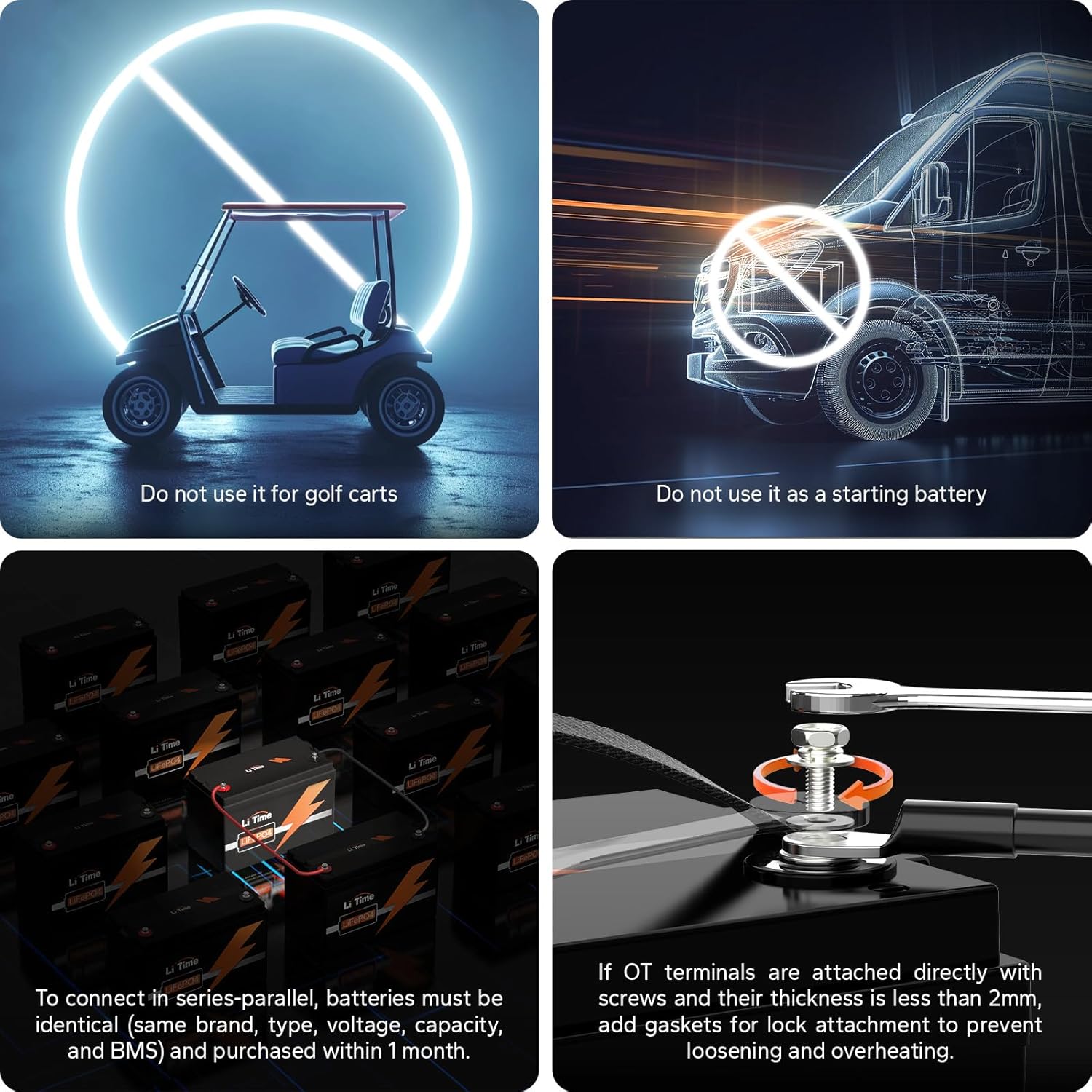 100A BMS with Full Protection: Built-in 100A BMS protects against overcharge over-discharge overheating and short circuits. Ensures safe operation in varied temperatures and conditions.