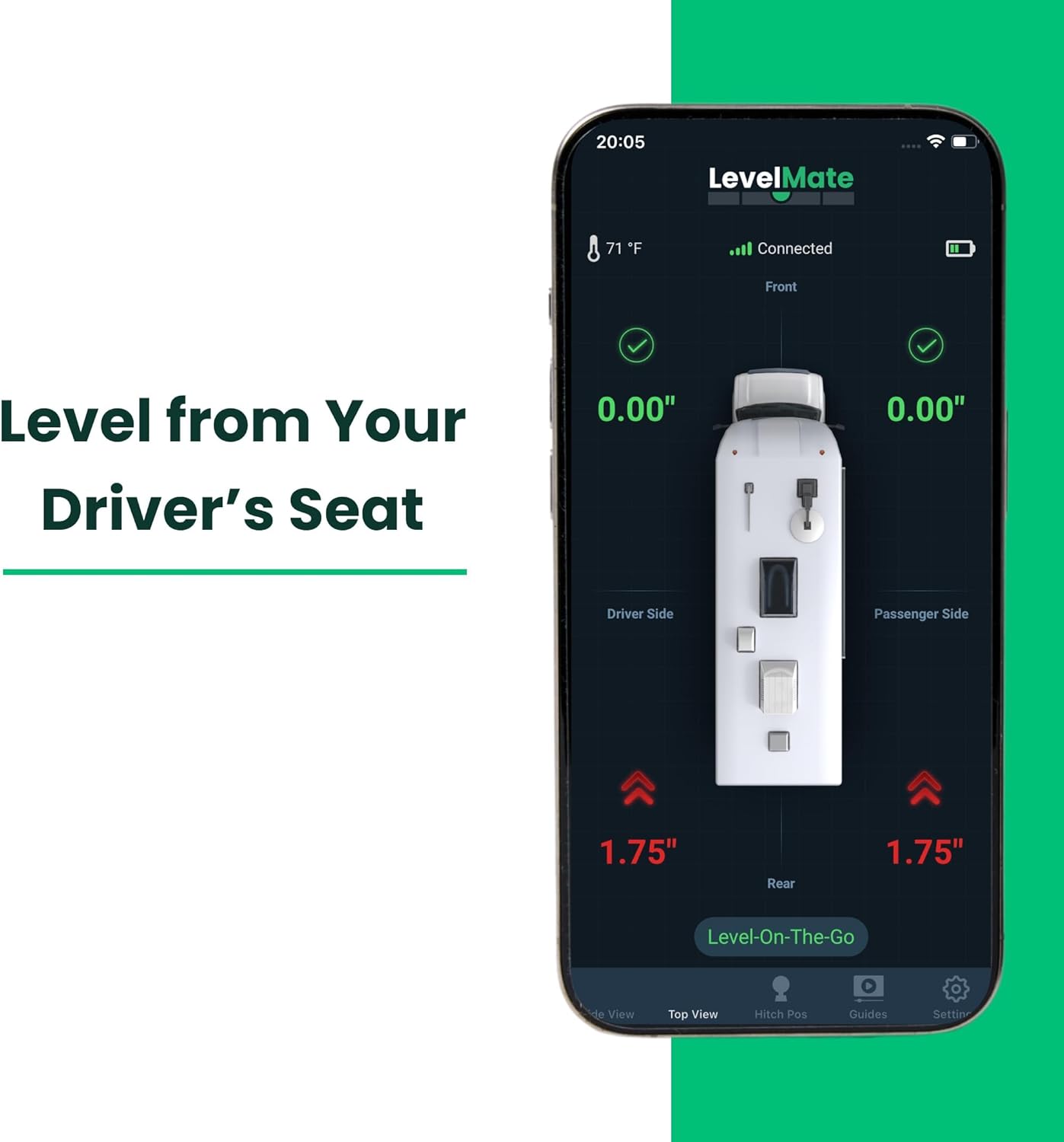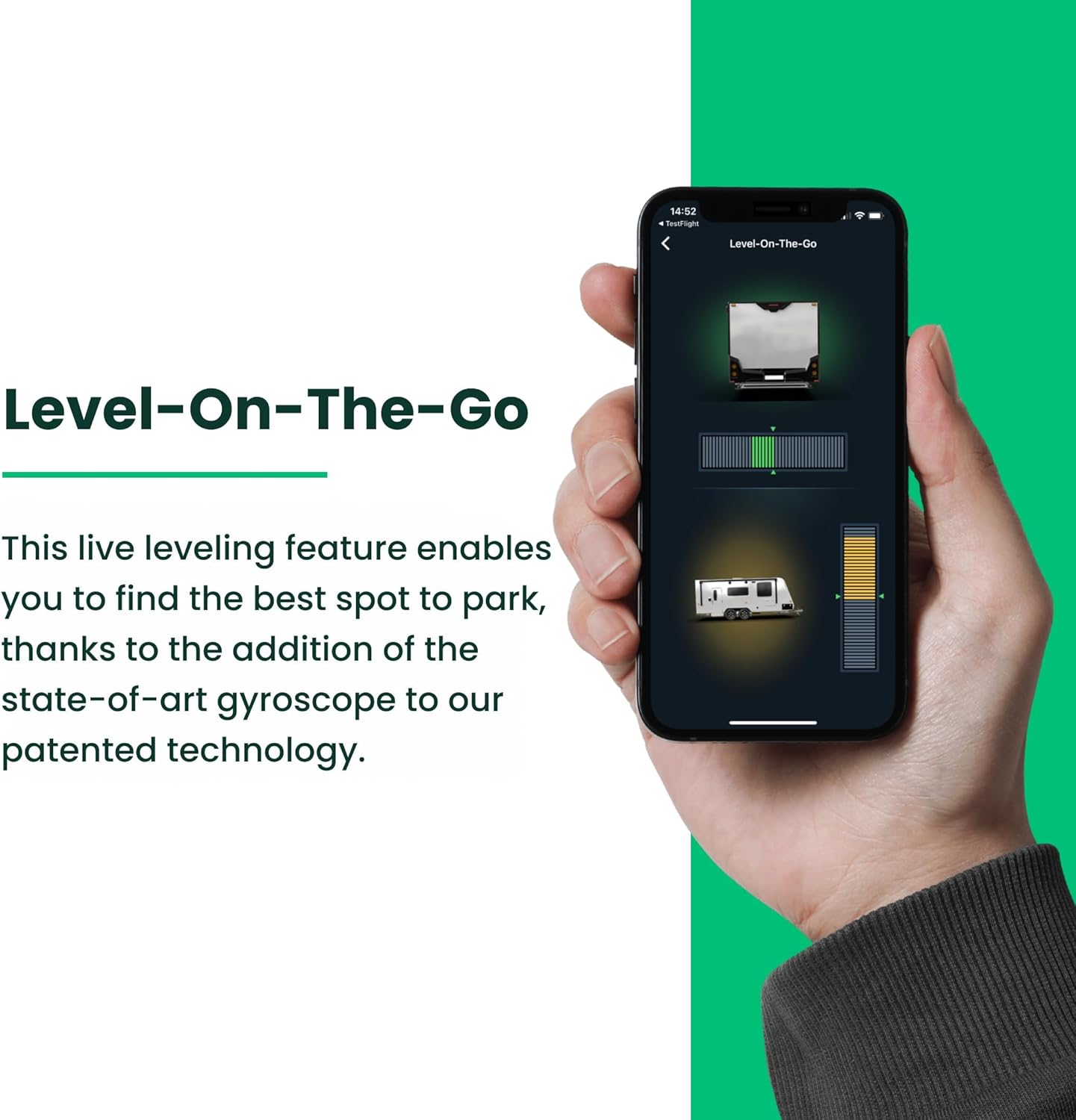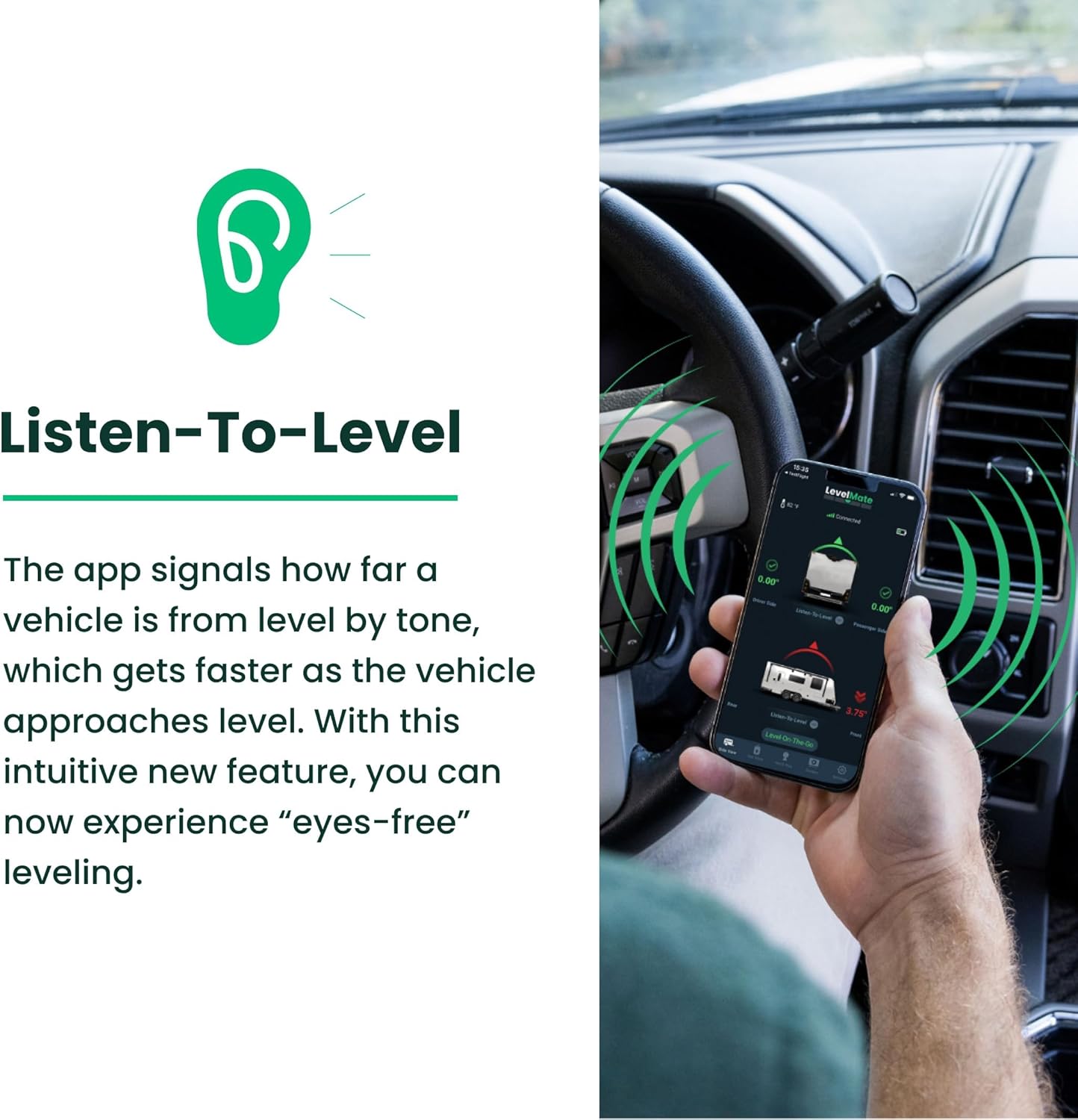 Listen-To-Level Feature: our patent-pending feature signals how far a vehicle is from level by tone which gets faster as the vehicle gets closer to level; users can experience eyes-free leveling