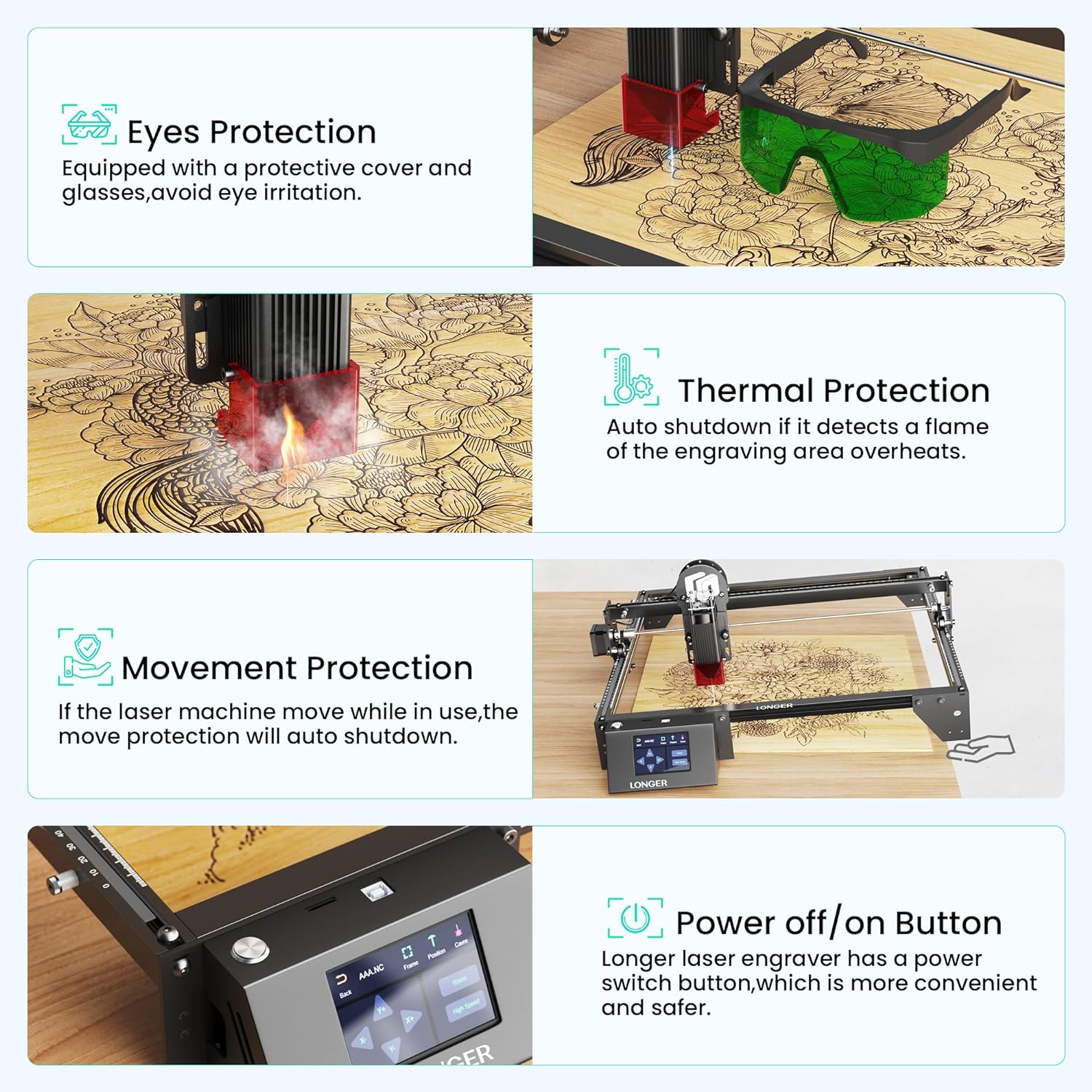 Safety FeaturesThe Ray5 5000MW laser engravering machine ensures safety with emergency shutdown and motion protection features. It also detects and prevents overheating and comes with protective covers and goggles for added safety.