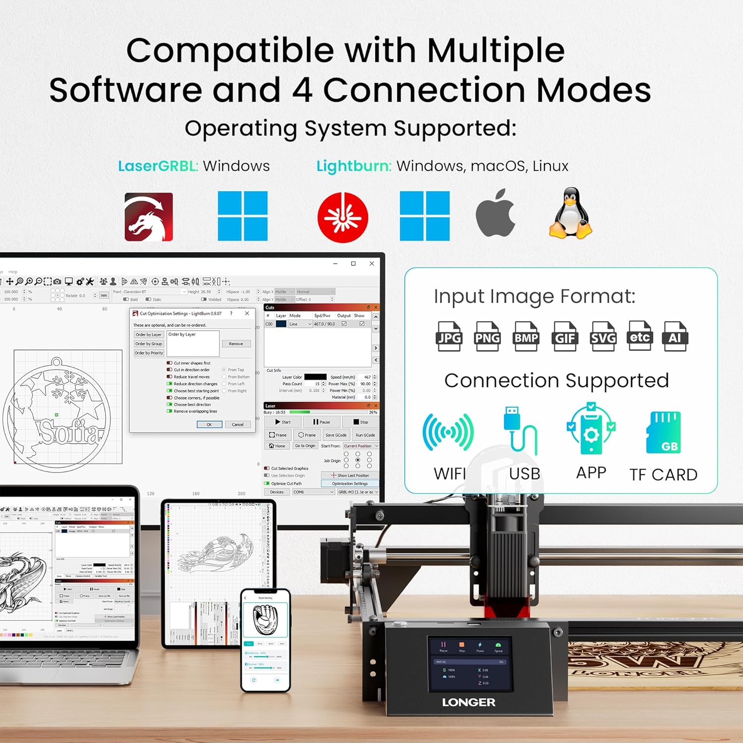 Flexible ConnectivityThe Ray5 5000MW laser engravers supports USB TF card WiFi and App connections for offline use. It's compatible with popular engraving software like LaserGRBL and LightBurn giving you options to suit your needs.