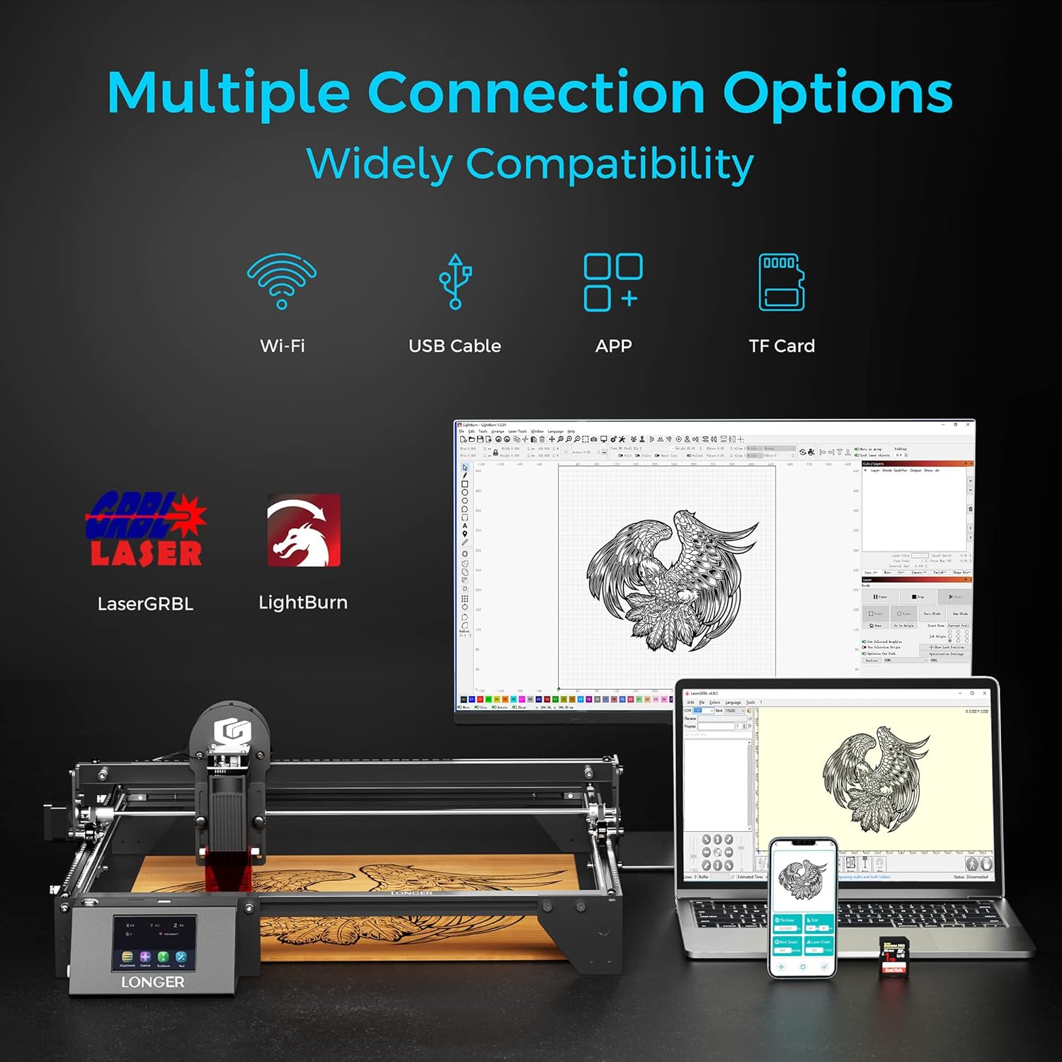 1Powerful & High Accuracy23.5-inch Touch Screen3Working Speed1Family Crafts2Business Creative 3Holiday Gifts Power Max Consumption60 WOptical Power Output10 - 11 WWorking Area 400x400mmDot Size at Optimal Focus0.06*0.06mmEngraving Accuracy0.01mmMore Convenient3.5 inch Touch Screen Support APPConnection TypeUSB/TF Card/Wifi/APPSoftwareLaserGRBL LightBurnSoftware Operating System(1) LaserGRBL: Windows (2) Lightburn: Windows macOS LinuxInput Image FormatJPG PNG BMP GIF SVG AI etc.