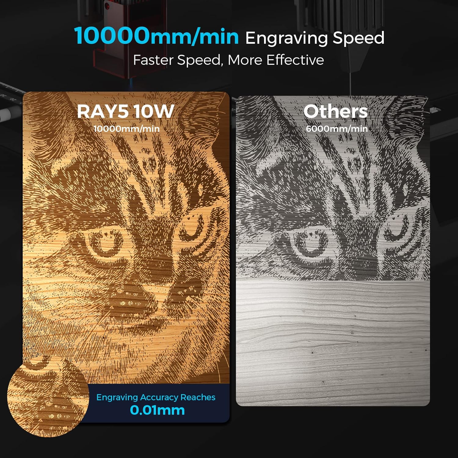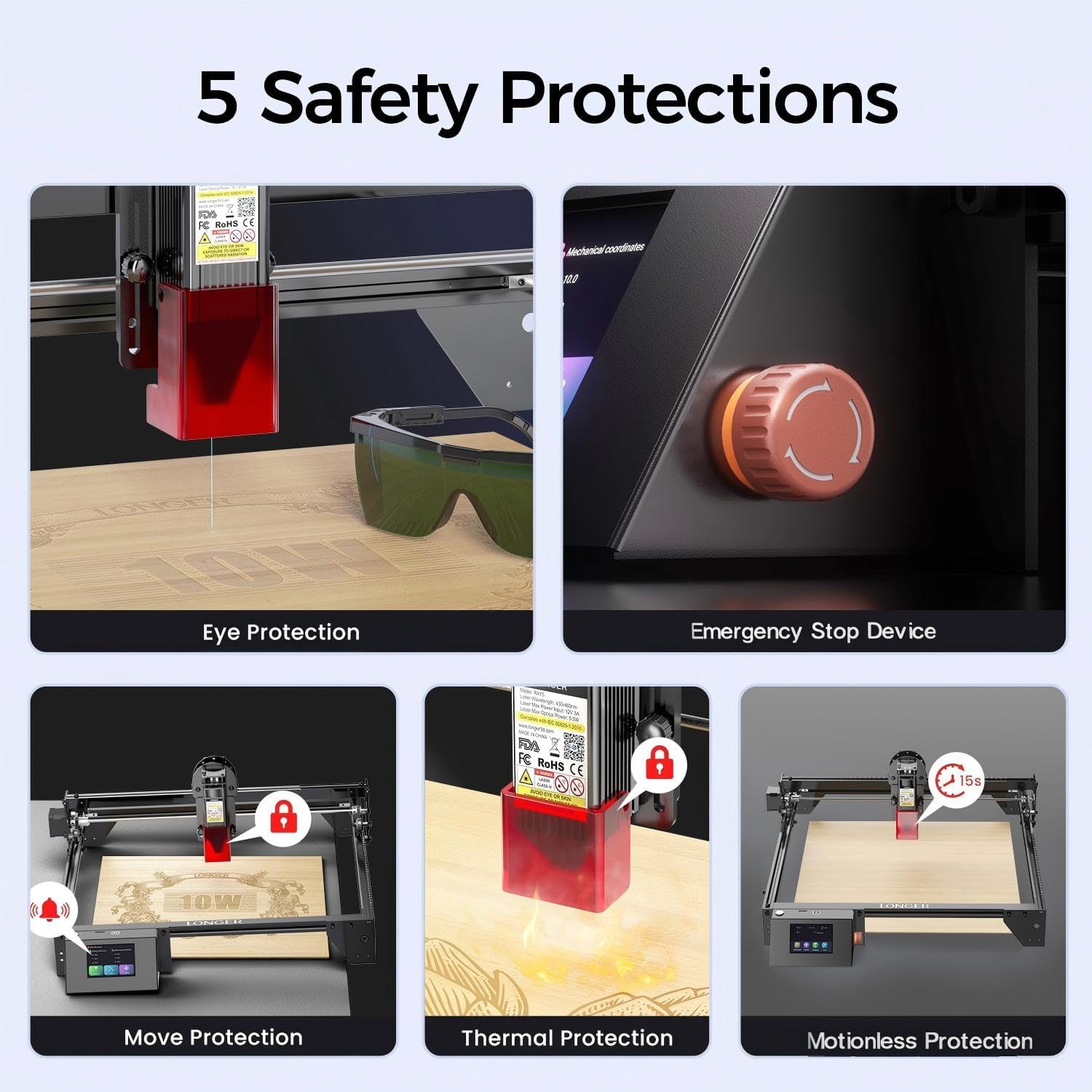 Safety Protection: The laser engraving machine has a protective cover and glasses which can effectively avoid eye irritation. RAY5 laser engraver has a built-in abnormal shaking and suspension program that automatically stops the machine when it detects abnormal shaking to ensure safety