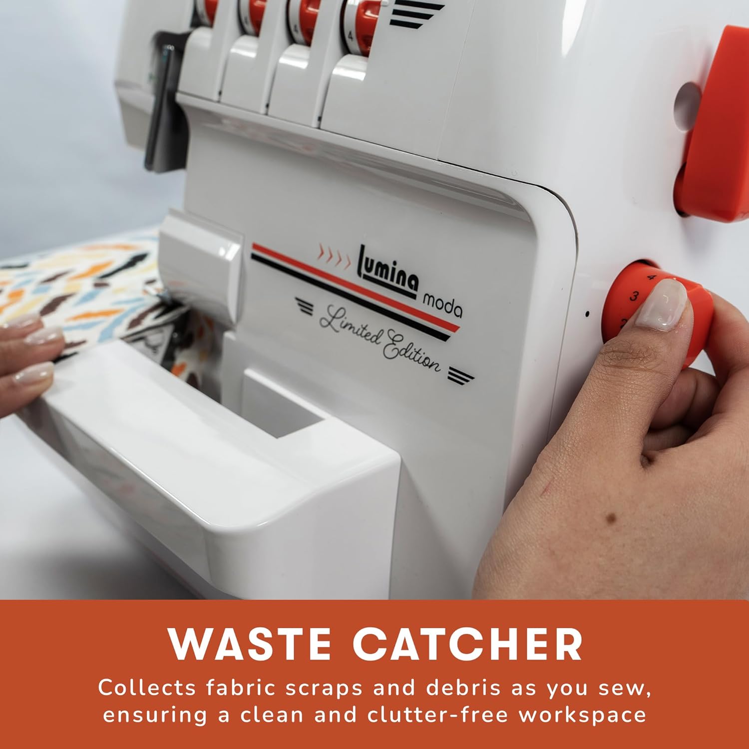 BUILT-IN TRIM TRAP FOR A TIDY WORKSPACE: Keep your sewing area clean and organized with your Moda built-in trim trap. It conveniently collects fabric scraps as you serge ensuring your workspace stays clutter-free. This feature is particularly useful for long sewing sessions where efficiency and cleanliness are crucial.