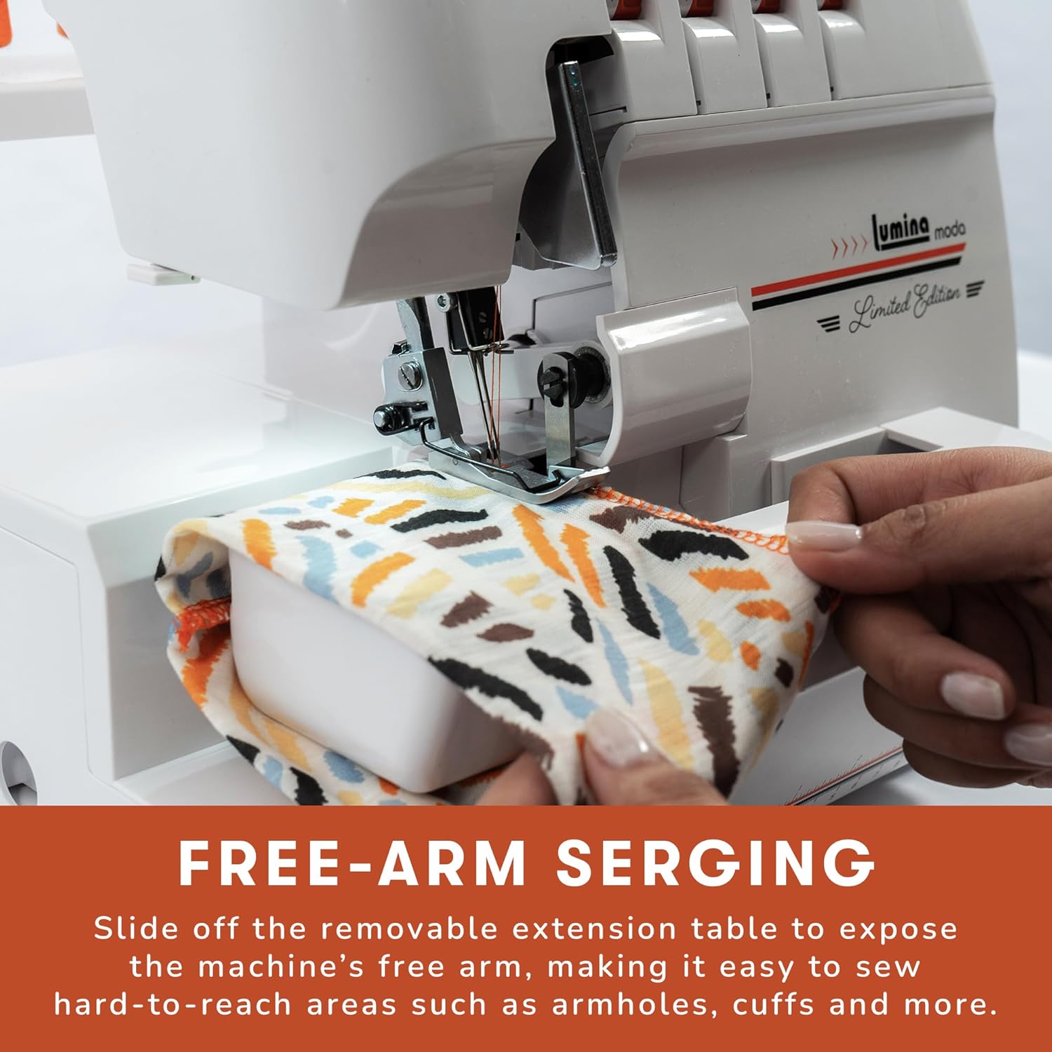 FREE ARM SERGER FOR TUBULAR PROJECTS: The Moda overlocker sewing machine includes a free arm for easy access to tubular areas like sleeves cuffs and pant legs. This feature is essential for sewing challenging hard-to-reach areas ensuring precision and ease when constructing garments or working on accessories.