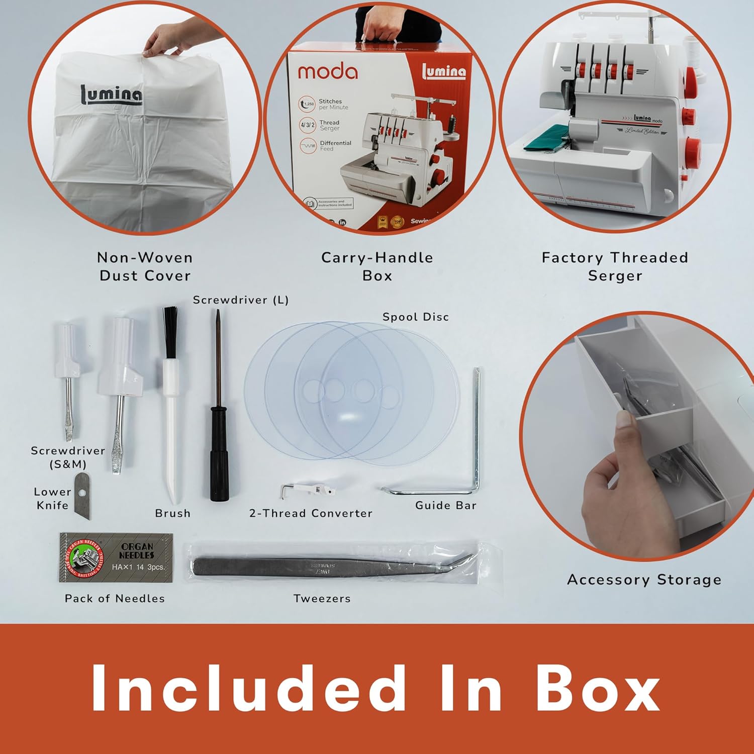COMPLETE WITH SERGER ACCESSORIES: This serger overlock machine comes equipped with essential serger accessories including extra serger needles tweezers and a trim trap. Whether you're threading with serger thread or adjusting settings for a specific project Moda provides all the tools needed for smooth professional-quality results.