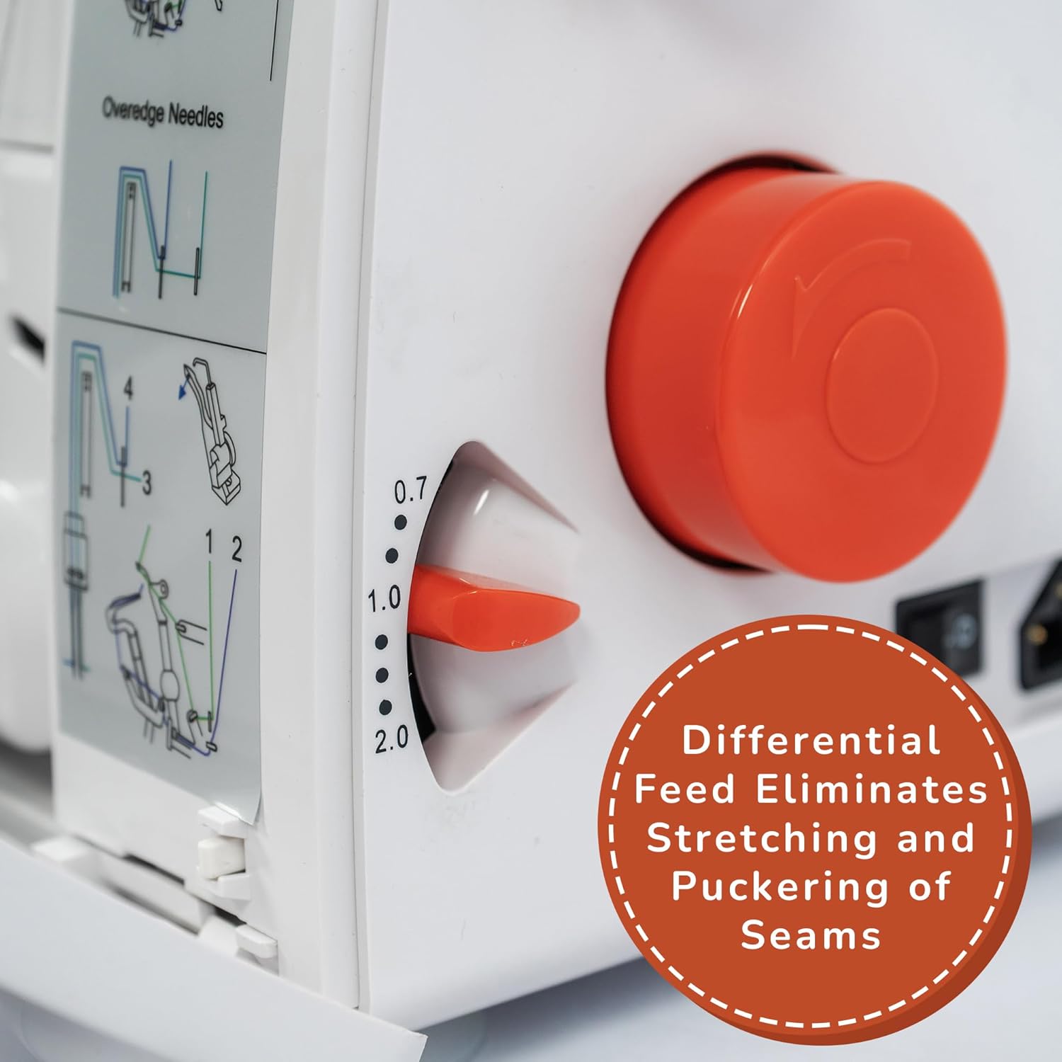 DIFFERENTIAL FEED FOR PERFECT FABRIC CONTROL: This serger overlock machine features adjustable differential feed preventing fabric puckering on lightweight materials and creating perfect gathers on stretchy fabrics. Whether you're working with knits or woven fabrics this overlock machine ensures smooth even stitches delivering a polished finish every time.