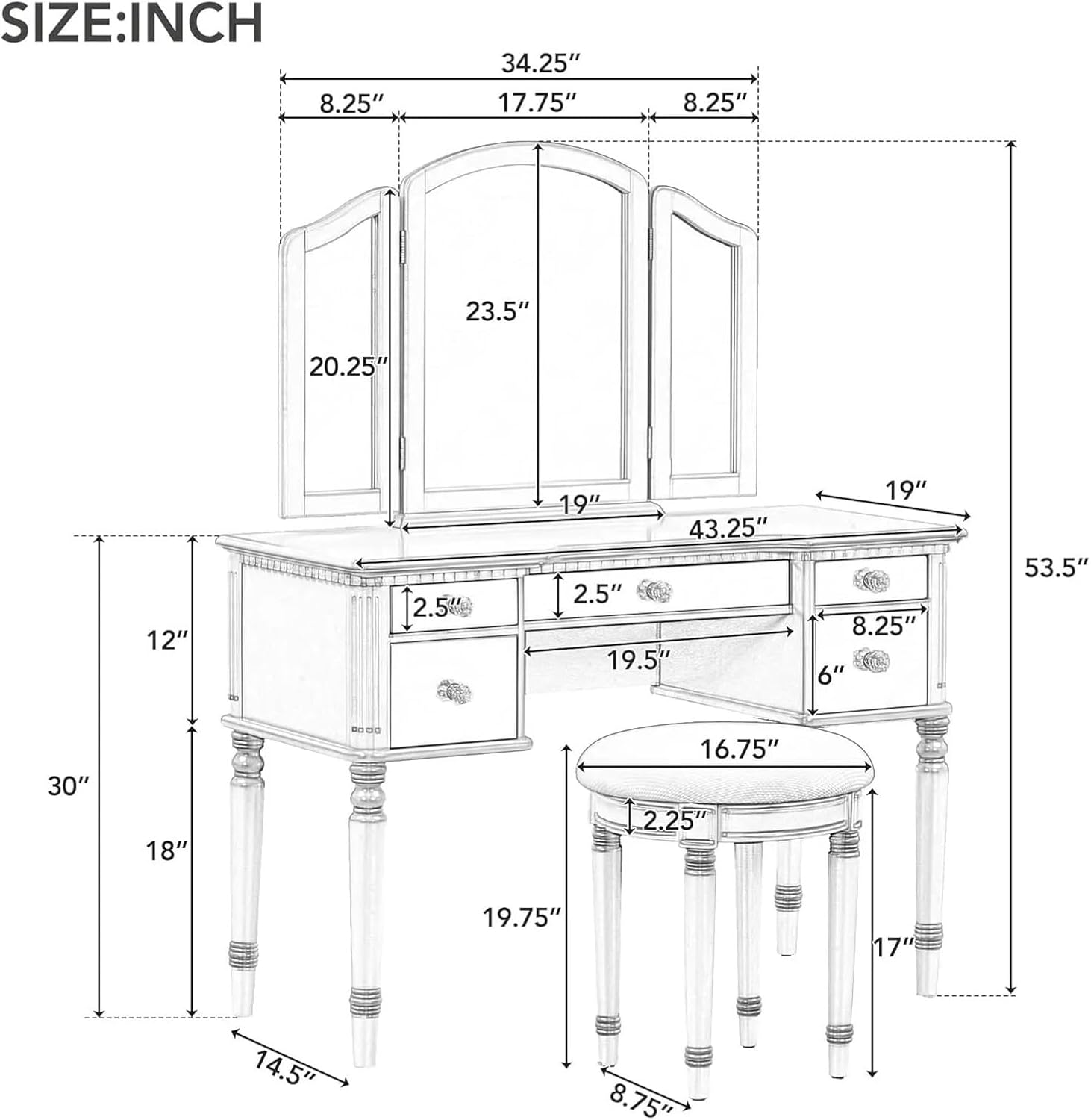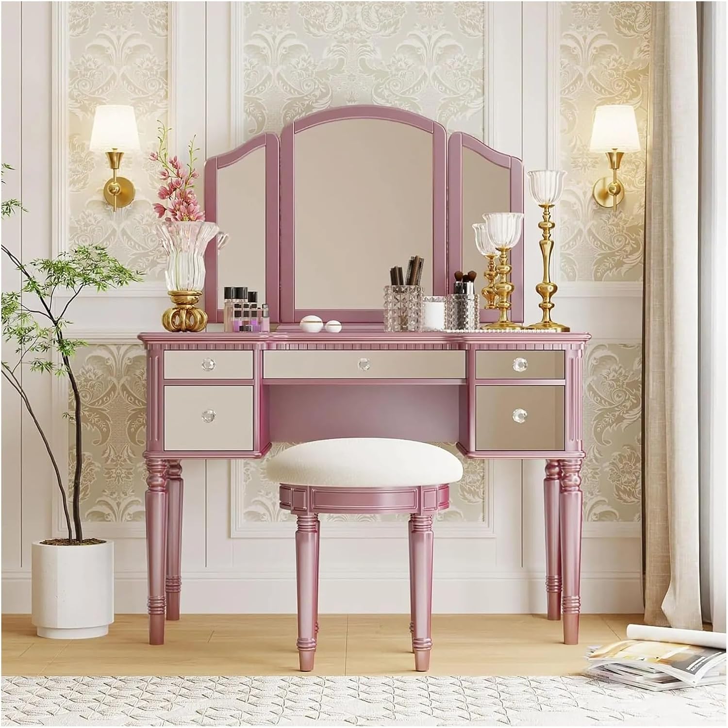 [Hkcvvresser Table with Spacious Storage Space and Seat]: This table has five drawers and the first three small drawers are lined with velvet to protect your precious jewelry and prevent scratches. Two large drawers provide ample space for storing various items. The accompanying stool features an ultra-soft cushioned seat providing comfort and style for you.