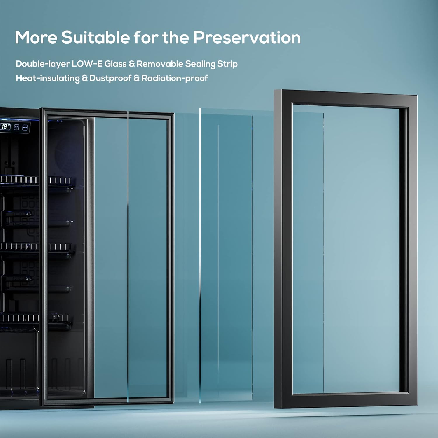 Double-Layer LOW-E GlassHigh-quality transparent glass with tightly fitted sealing strips greatly enhance the effect of heat and dust insulation reducing the influence of the external environment and making the internal temperature and humidity level more stable which is not only conducive to energy saving but also more suitable for wine storage