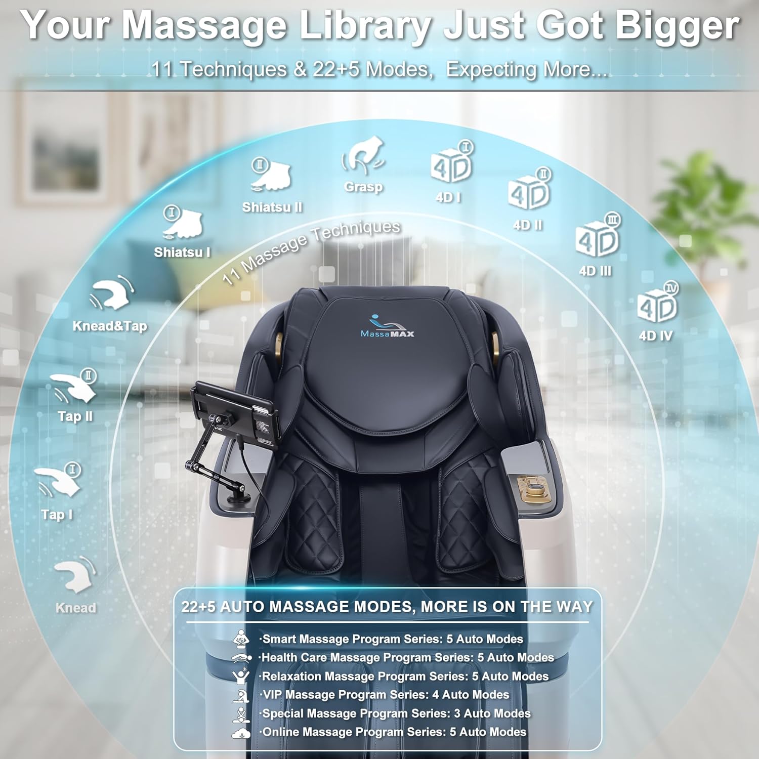 [OTA Cloud Technology] Your Chair Never Gets Old. > Access an expanding library of 27+ professional massage programs via our cloud server. With new sequences added regularly through seamless OTA (Over-the-Air) updates your massage experience stays fresh and evolves with the latest wellness techniques.